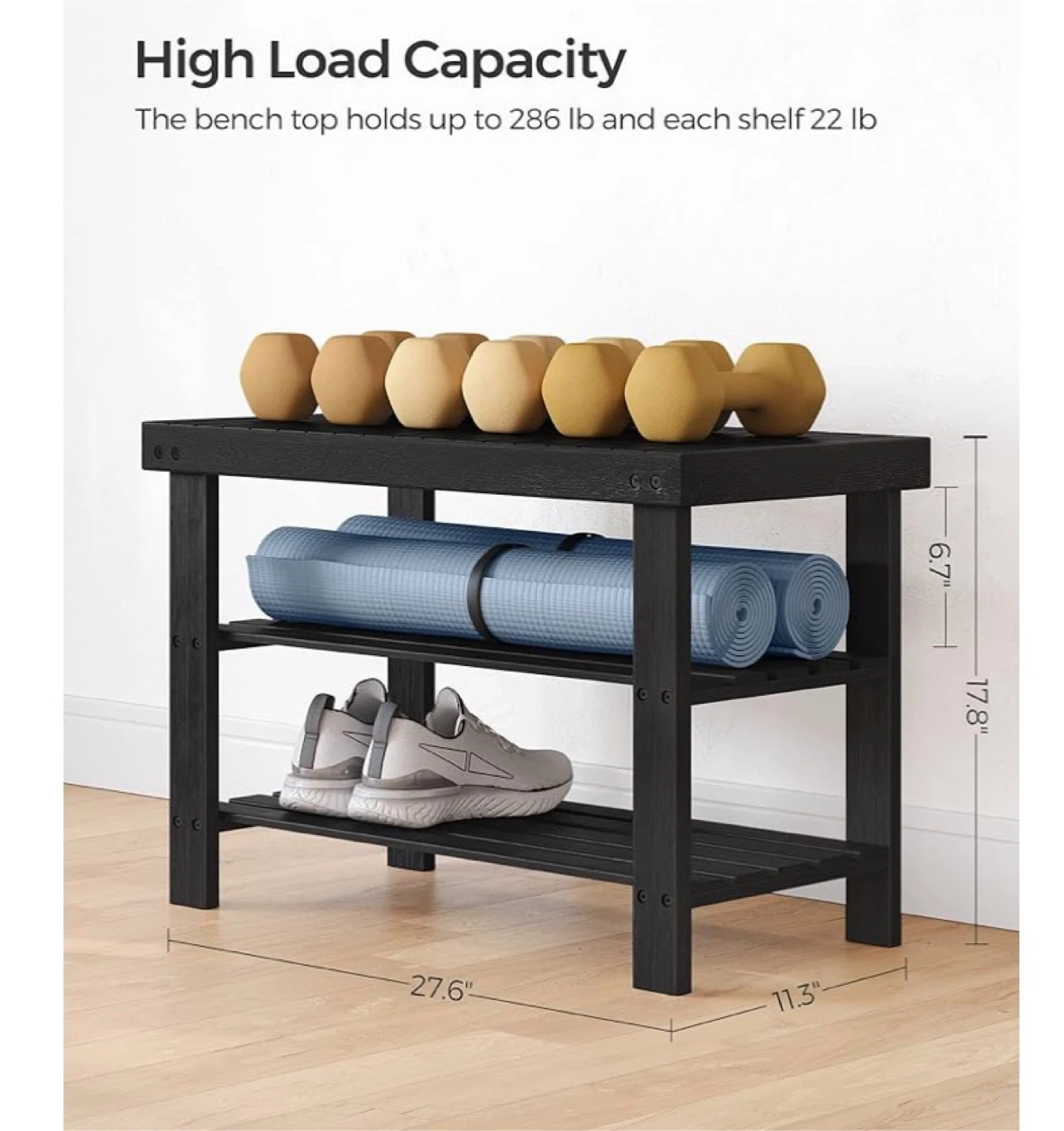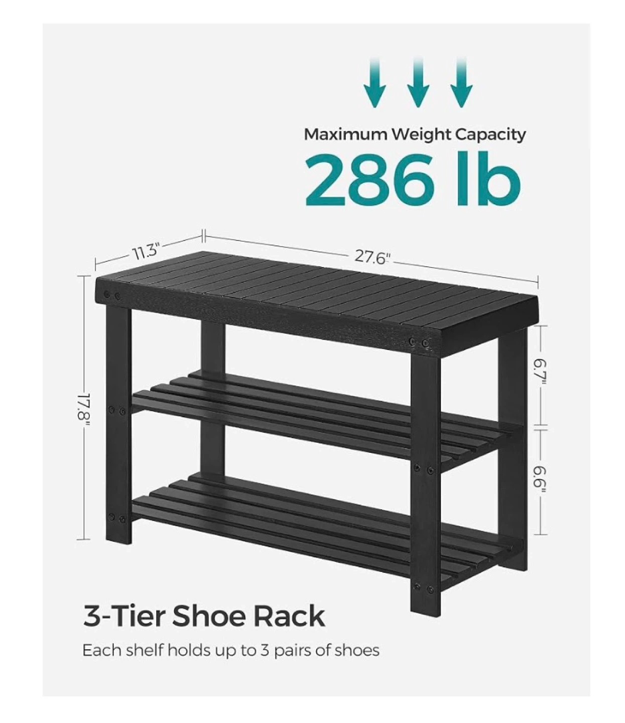 A 3-tier shoe rack bench. Its top holds up to 286 lb, and each shelf holds up to 22 lb. It's 27.6 inches long, 11.3 inches wide, and 17.8 inches tall. This bench is useful for storing shoes near an entryway.
