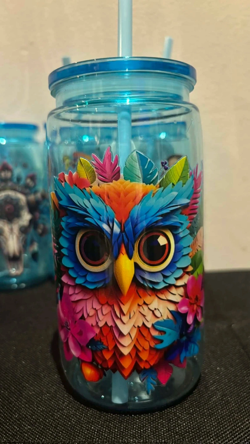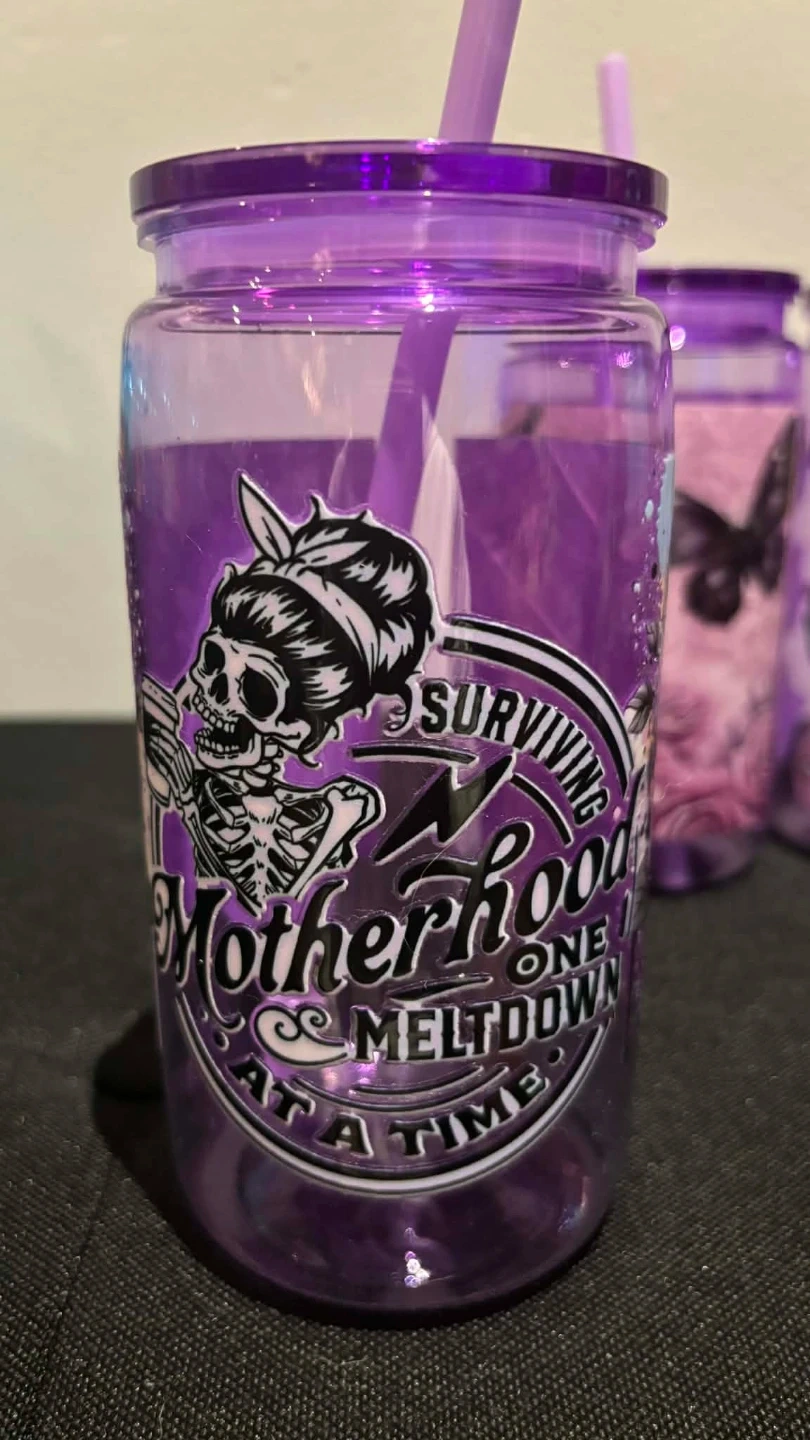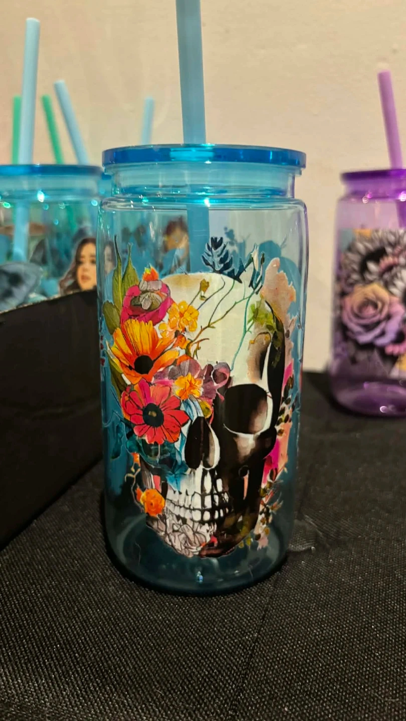 This set includes five unique tumblers, each featuring a different eye-catching design. They come with matching reusable straws and lids. These tumblers are perfect for enjoying your favourite beverages on the go! $12 dollars each