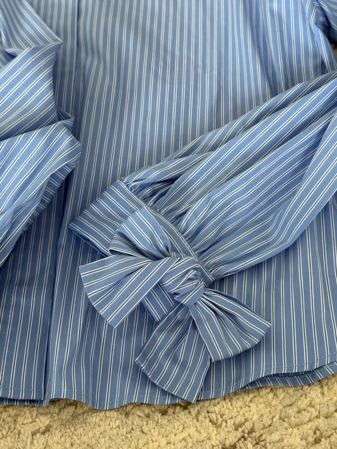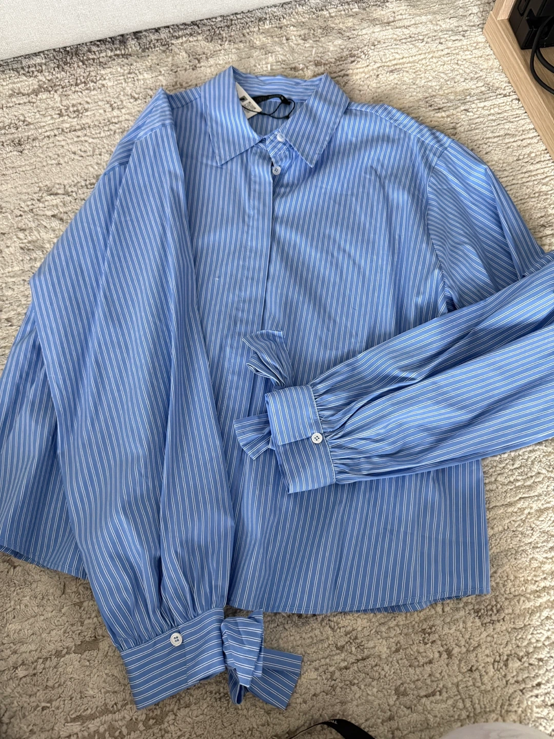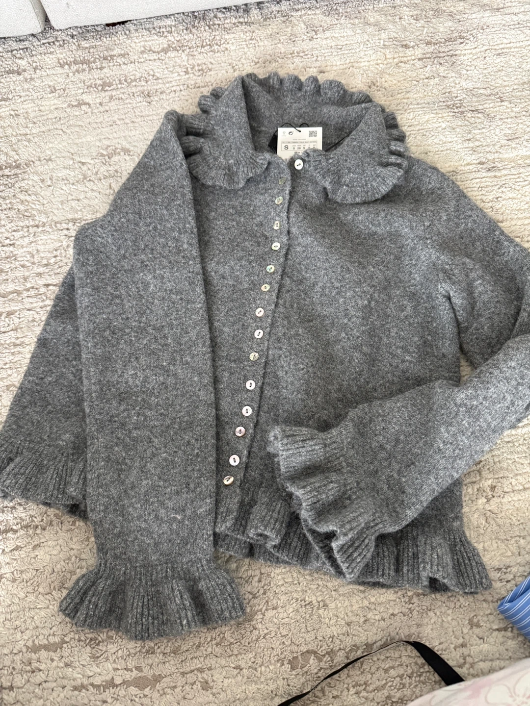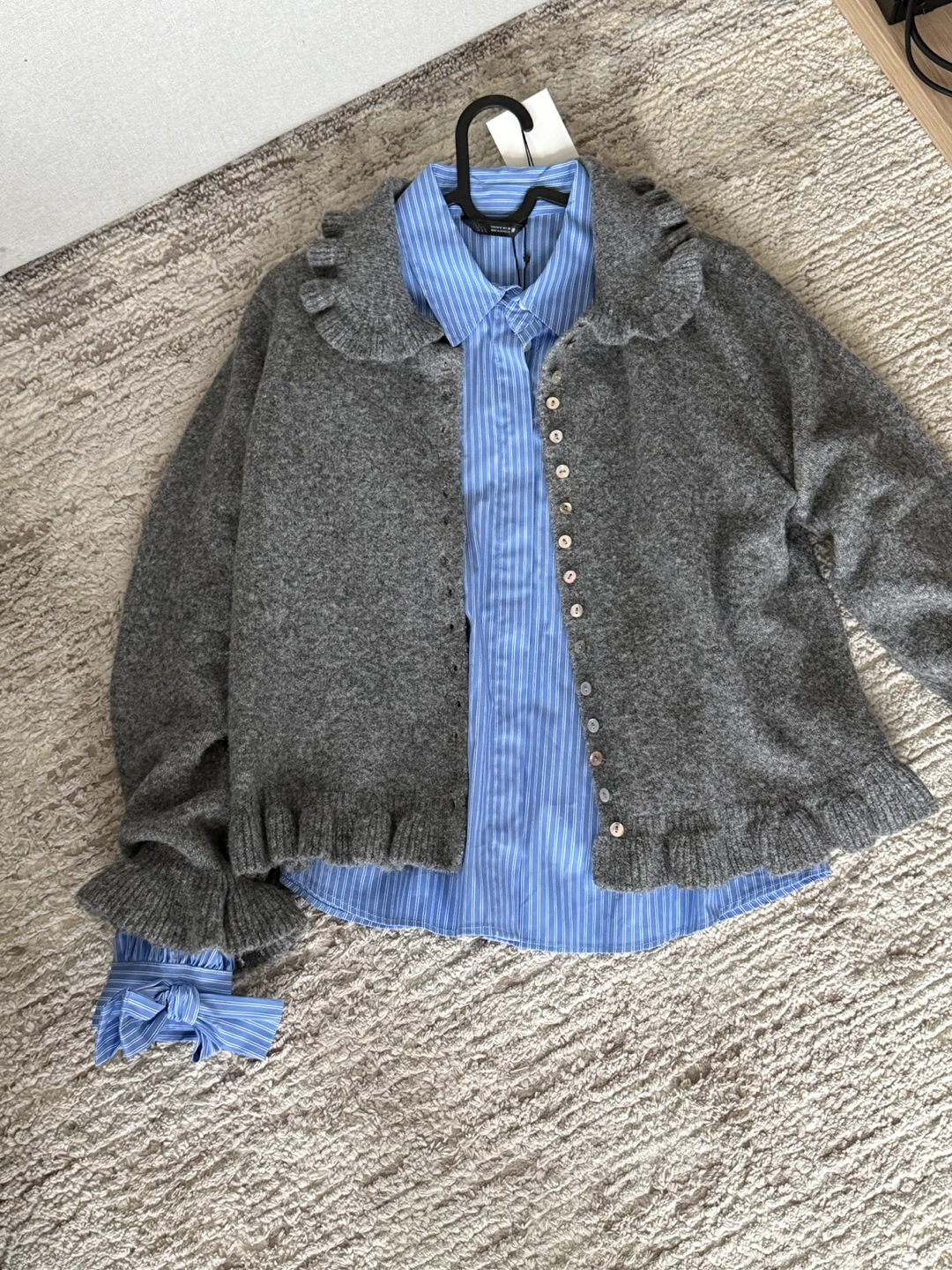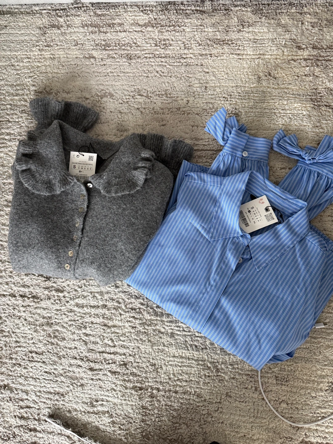 This is a Zara grey knit cardigan with ruffle collar and button front. And a blue and white pinstripe button-up shirt, featuring gathered cuffs with bows. Both pieces are size small and new with tag on.