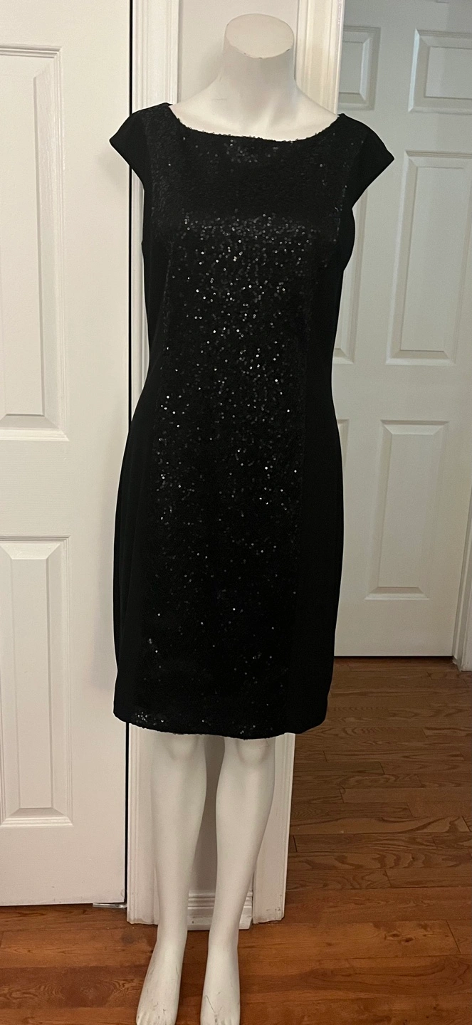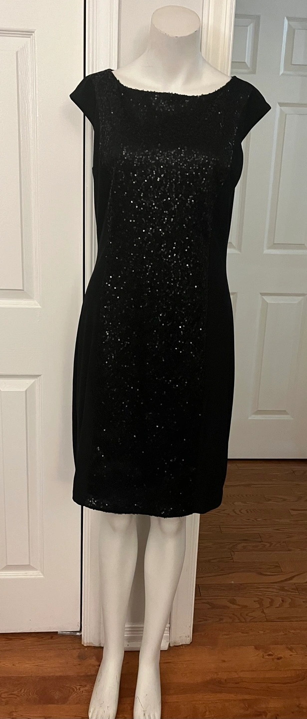 Sparkly black sequined dress from American Living. It's a size 10. Shell is 95% polyester and 5% elastane; lining is 100% polyester.