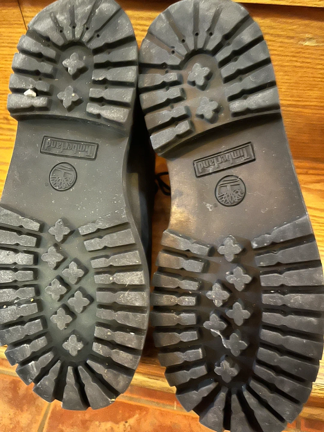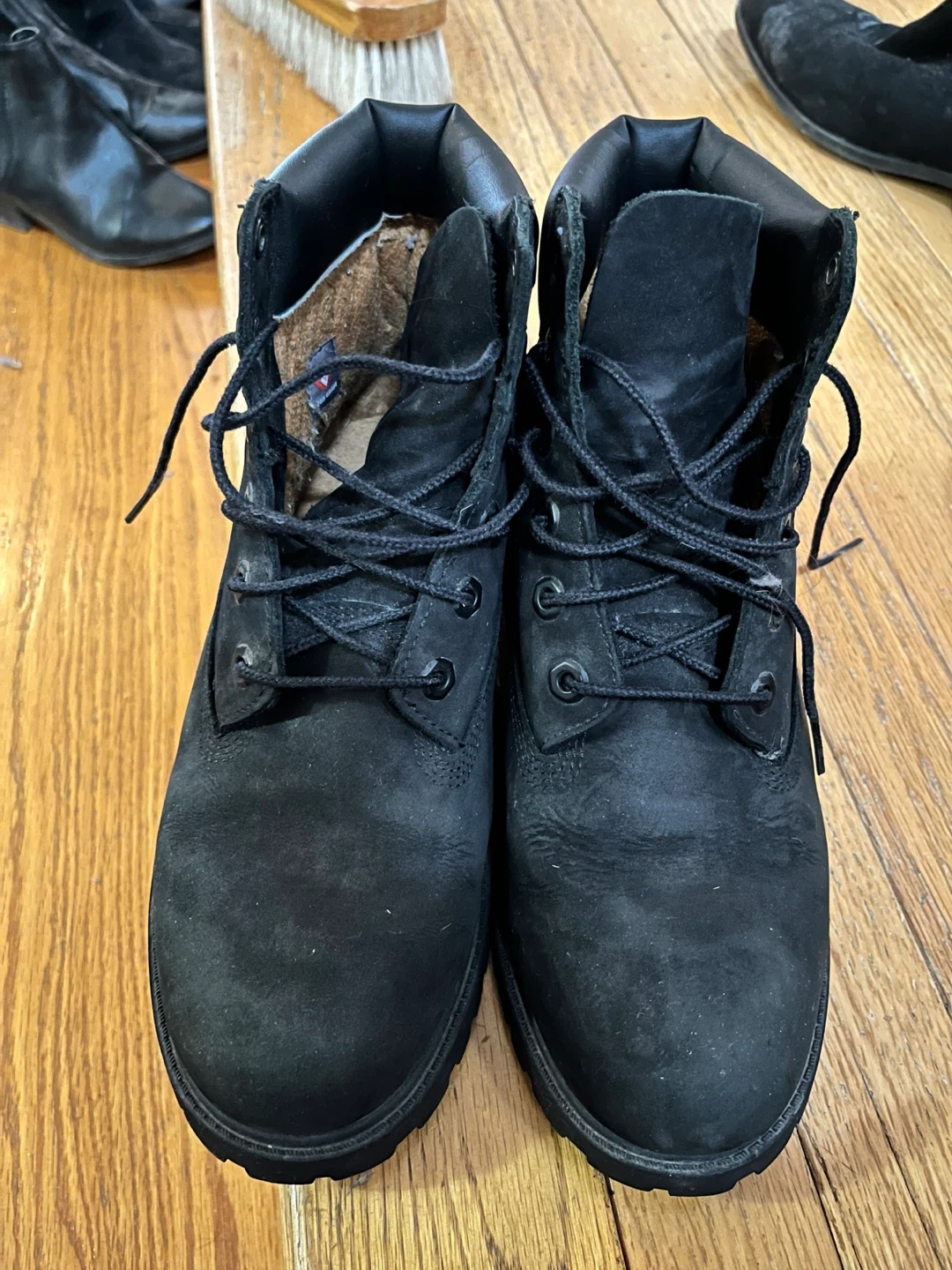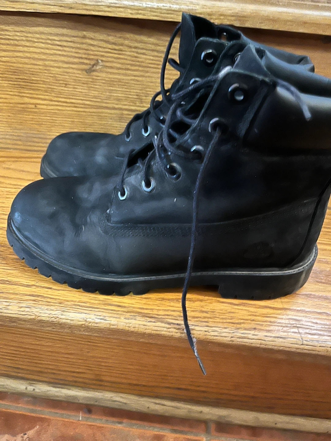 These are black Timberland lace-up boots. They're made with a durable leather material. Great for everyday wear or for rougher terrain!