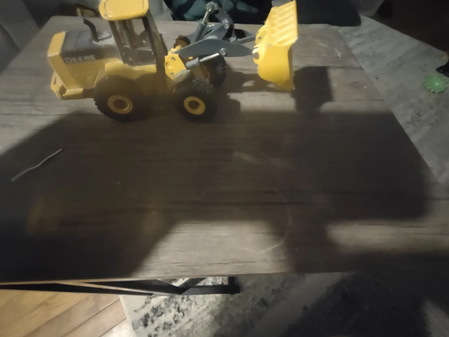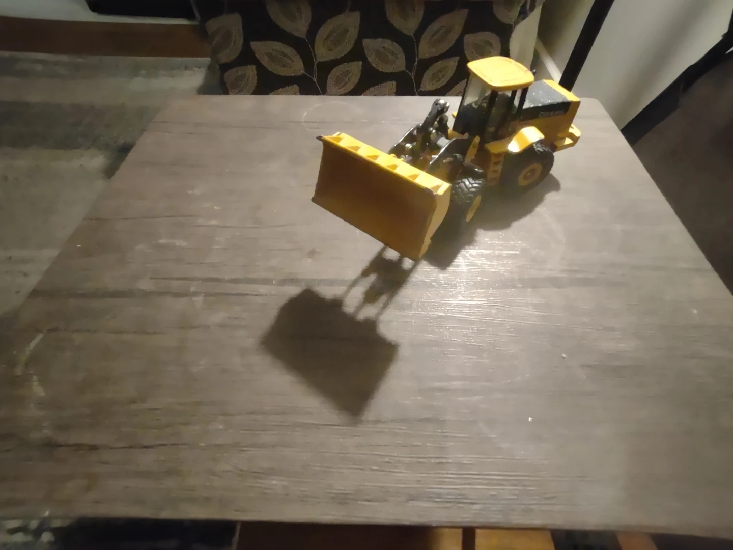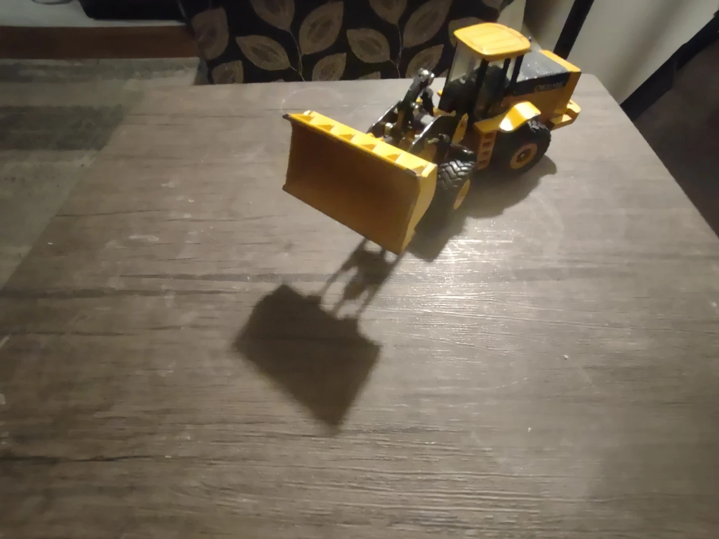 This is a yellow John Deere front loader toy. It has articulated steering and a movable loader bucket. Made from durable steel.