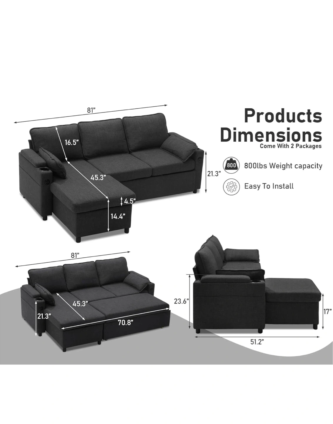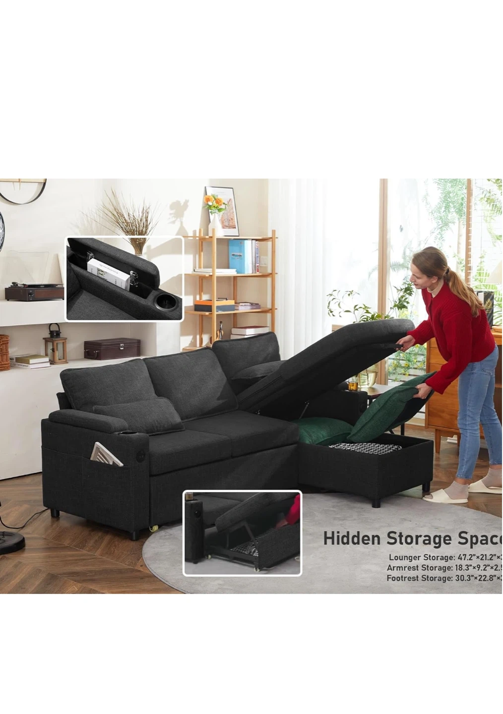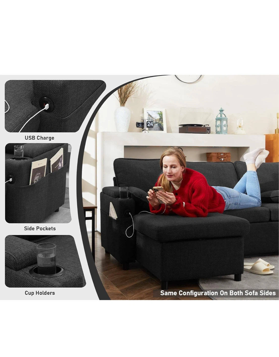 Dark Grey Sectional Sofa with USB Charging and Storage