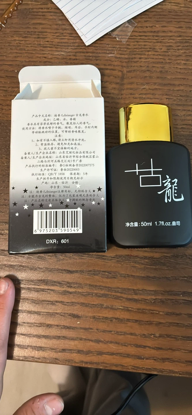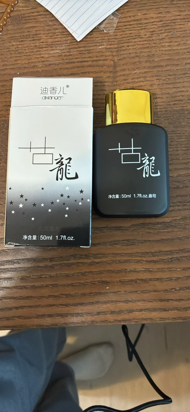 This is a 50ml bottle of Dilancor Gu Long Eau de Parfum. It comes in a sleek black bottle with a gold cap. The fragrance is designed for men.