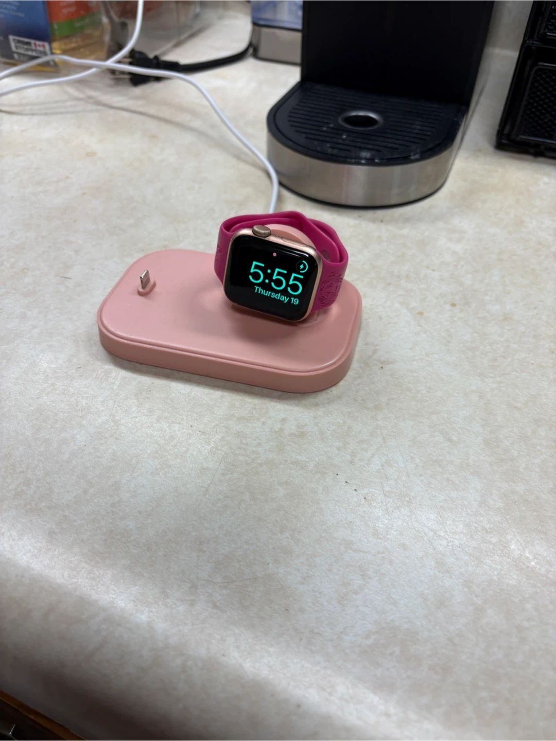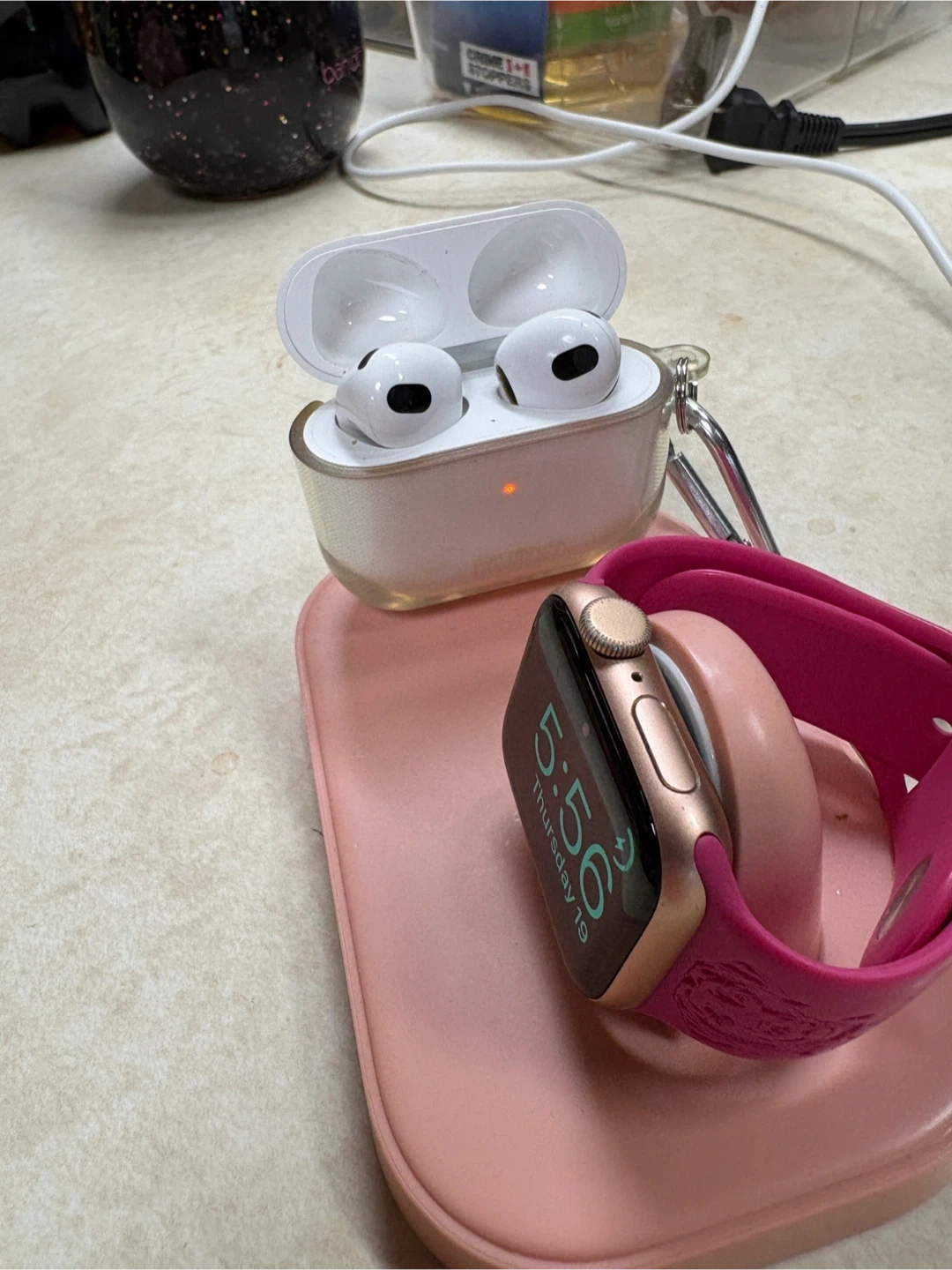 This pink charging stand is designed for your Apple Watch and AirPods. It features a dedicated spot for watch charging and a lightning connector for your AirPods. Keep your devices powered up and organized! Comes with cord and block.