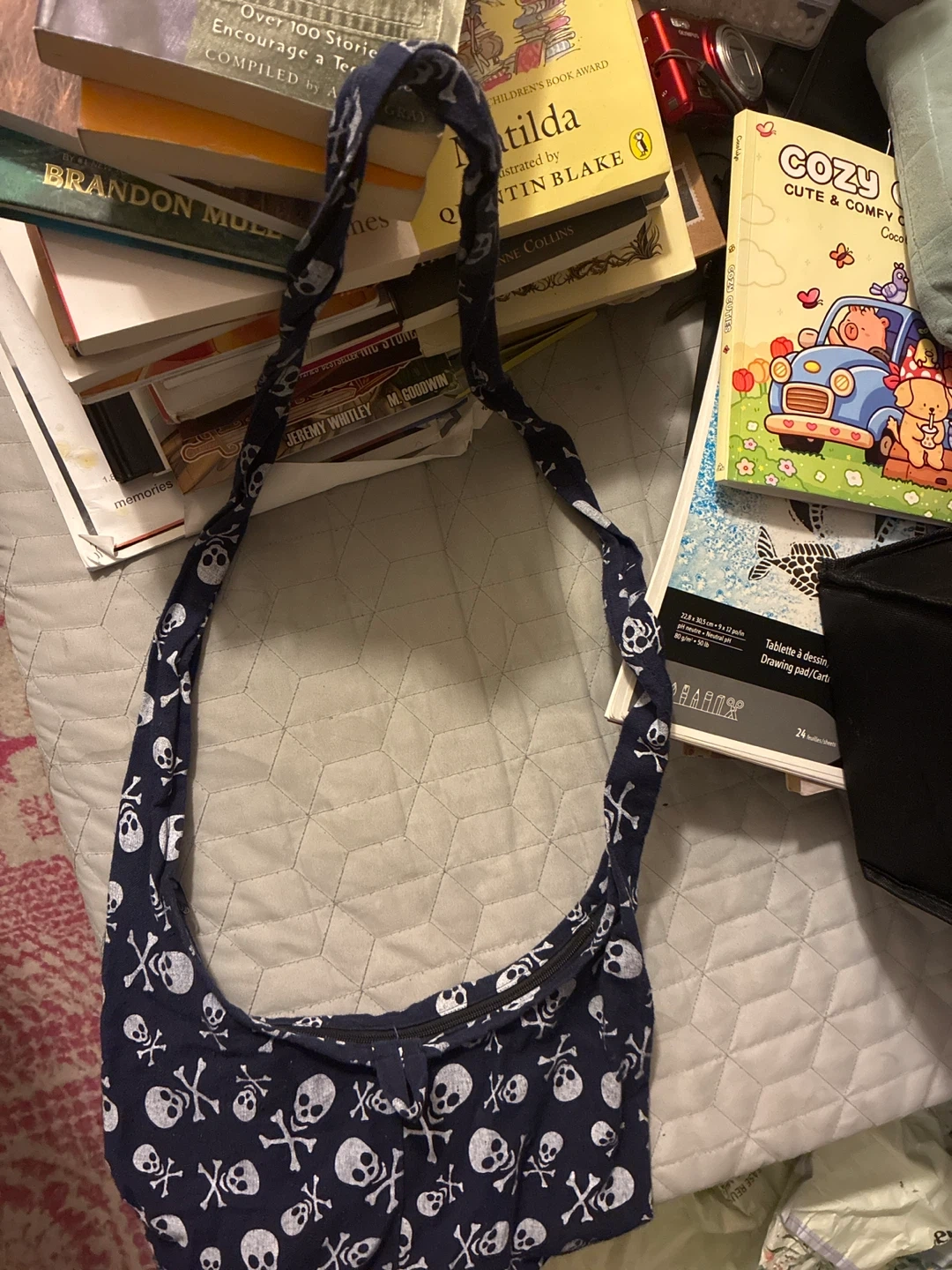 This navy blue messenger bag features an all-over skull and crossbones print. It's a great size for carrying everyday essentials. The button popped off but there’s a zipper. Cash only.
