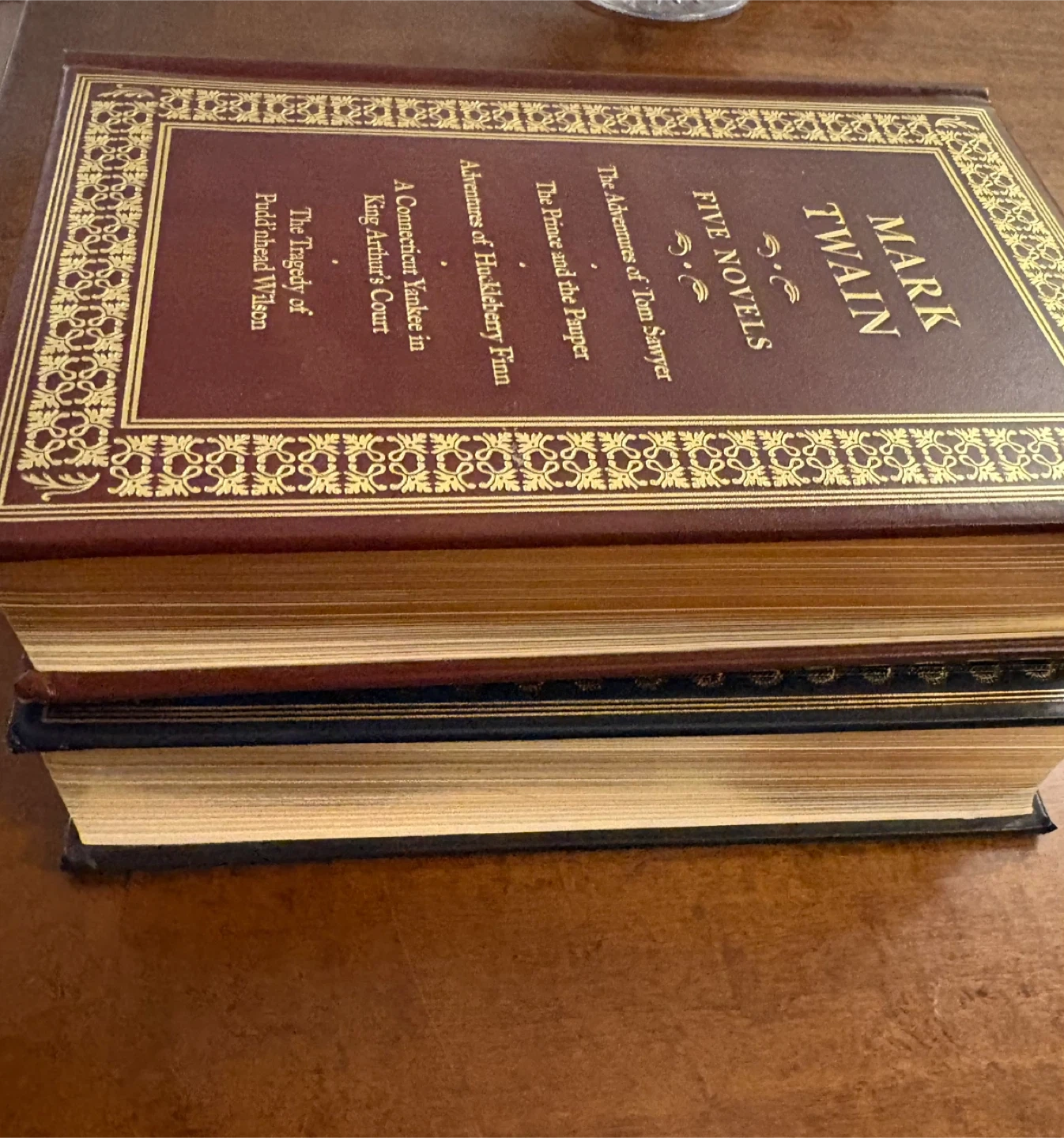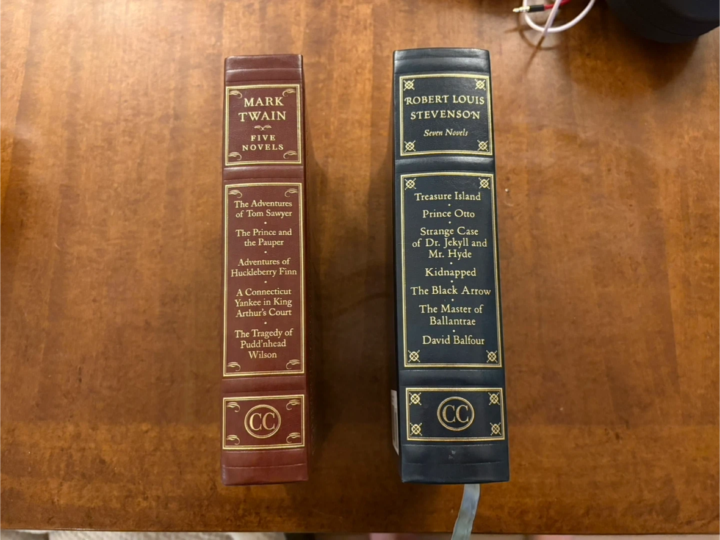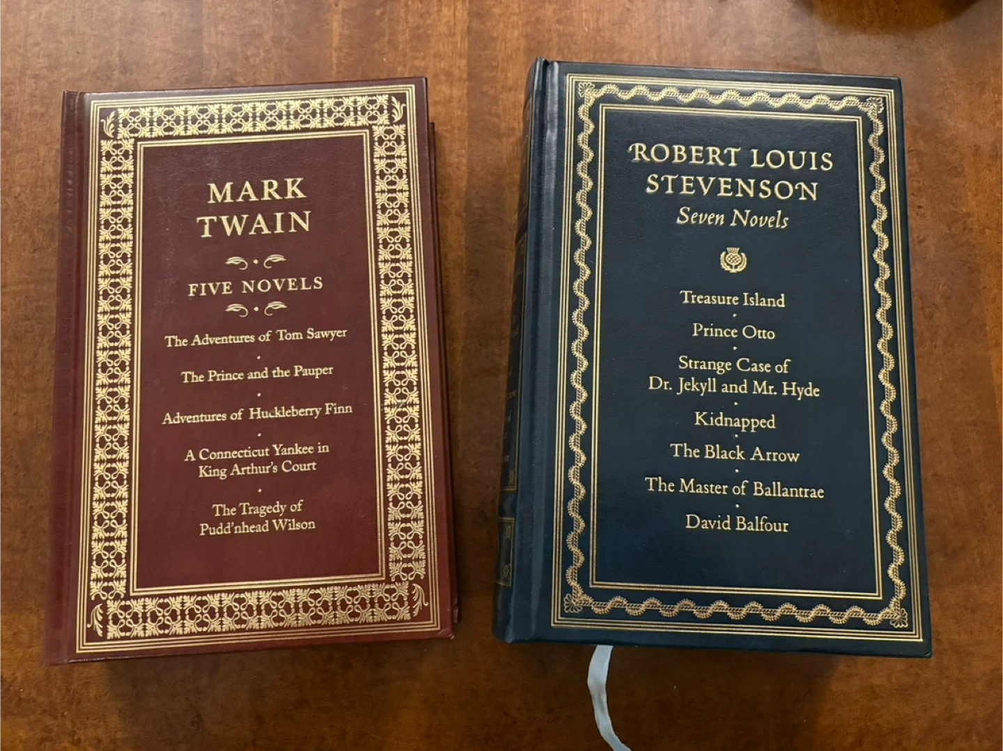 Beautiful leather-bound Collector’s Edition volumes with gold detailing. Includes: Mark Twain – Five Novels • The Adventures of Tom Sawyer • The Prince and the Pauper • Adventures of Huckleberry Finn • A Connecticut Yankee in King Arthur’s Court • The Tragedy of Pudd’nhead Wilson Robert Louis Stevenson – Seven Novels • Treasure Island • Prince Otto • Strange Case of Dr. Jekyll and Mr. Hyde • Kidnapped • The Black Arrow • The Master of Ballantrae • David Balfour Elegant decorative spines with gold embossing. Perfect for a home library, office display, or classic literature collection.