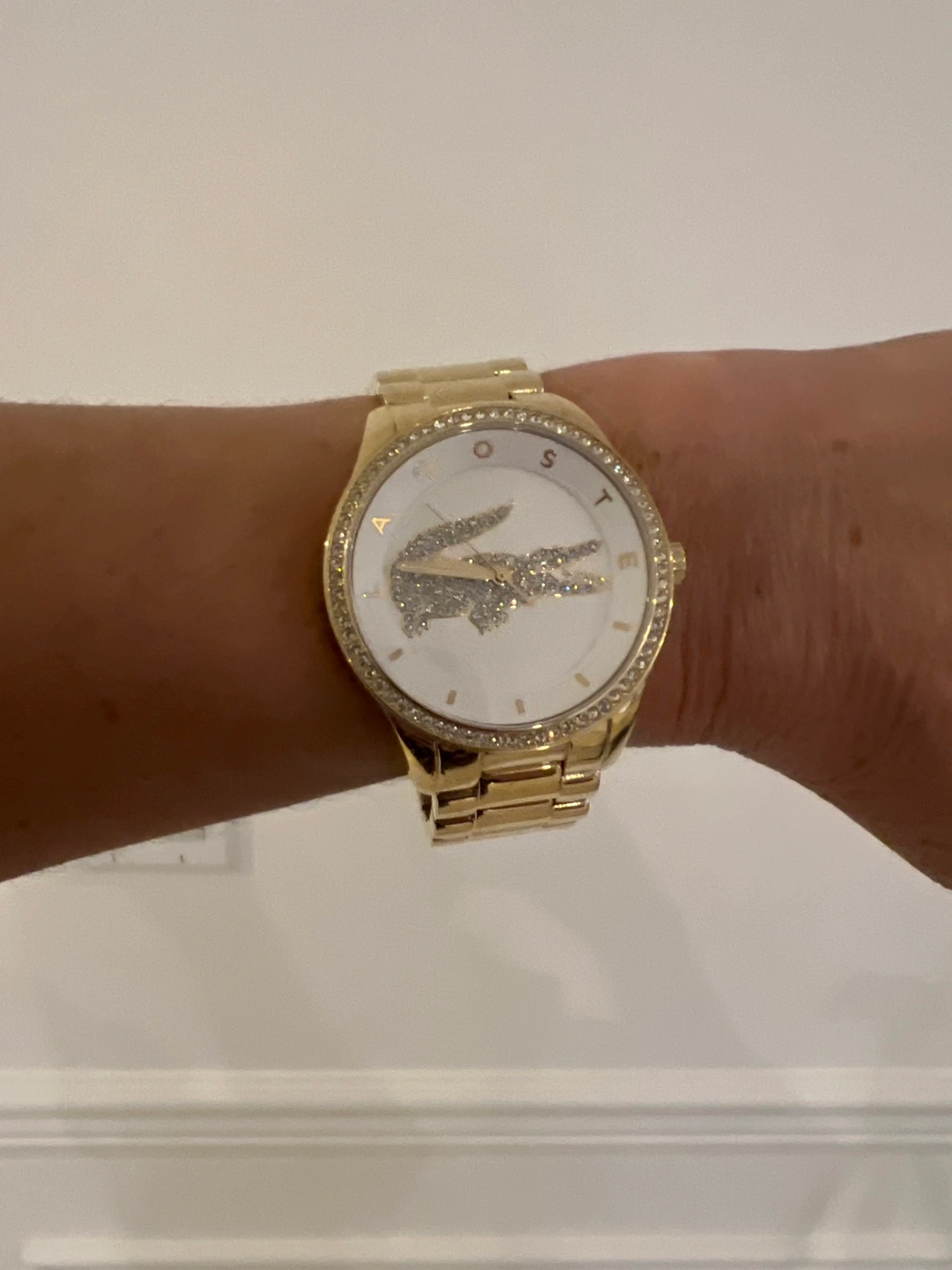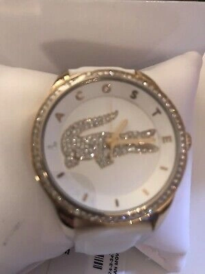 This is a gold and white Lacoste watch. It features a white face with a gold Lacoste logo. The logo is adorned with crystals. The watch has a gold band. It is in excellent condition.