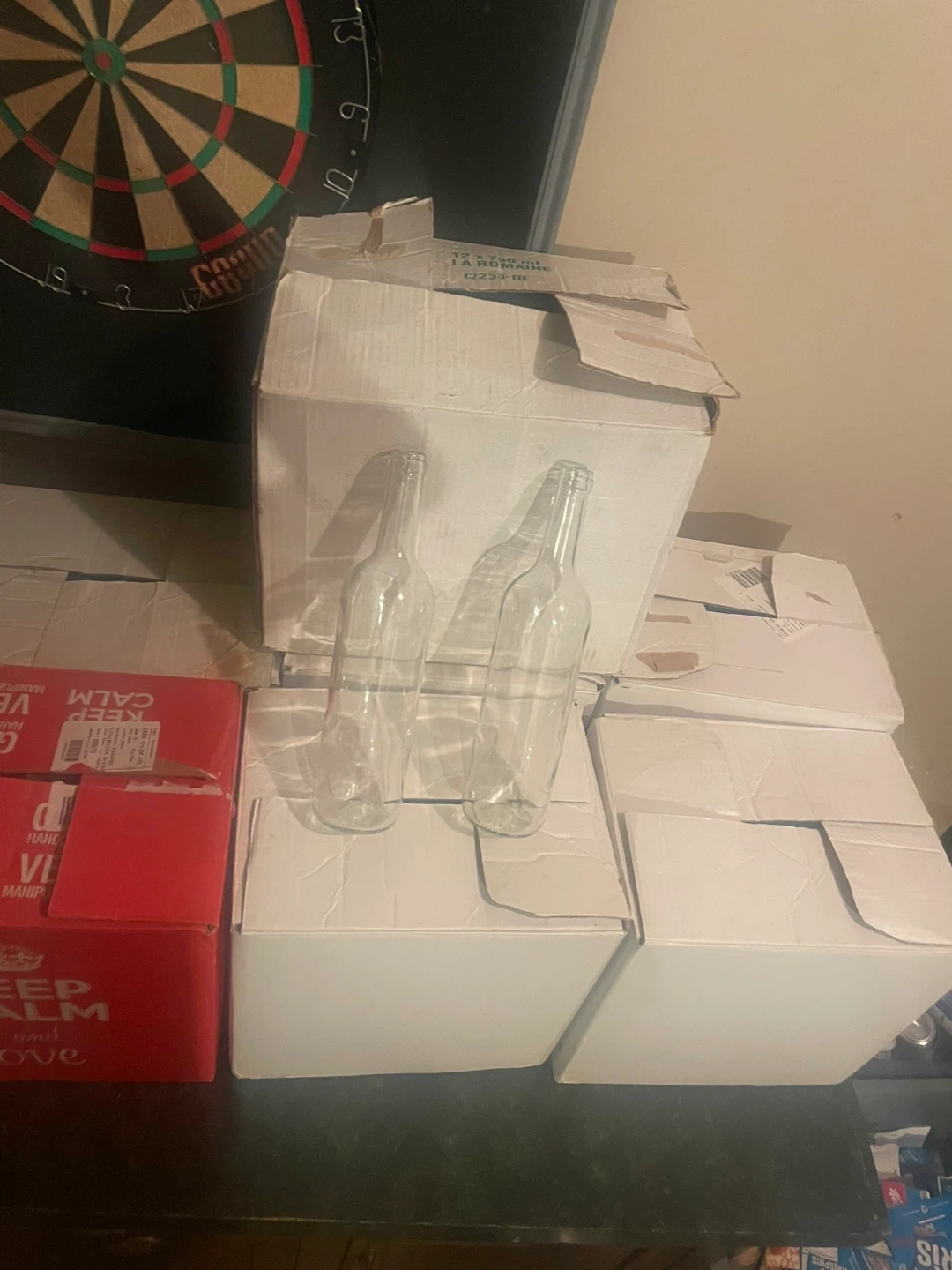 7 cases of 12 clear glass bottles, perfect for home made wine or decorative projects.
