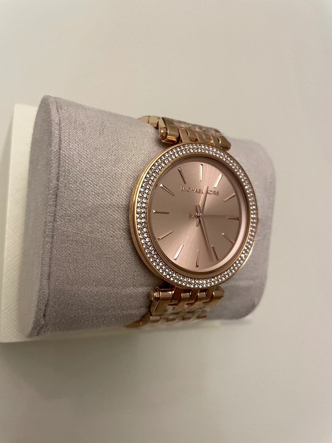Beautiful Michael Kors women's watch in rose gold. It comes with its original box and it’s Brand New never worn! The watch features a crystal-set bezel, adding a touch of sparkle. Perfect for adding a touch of elegance to any outfit!