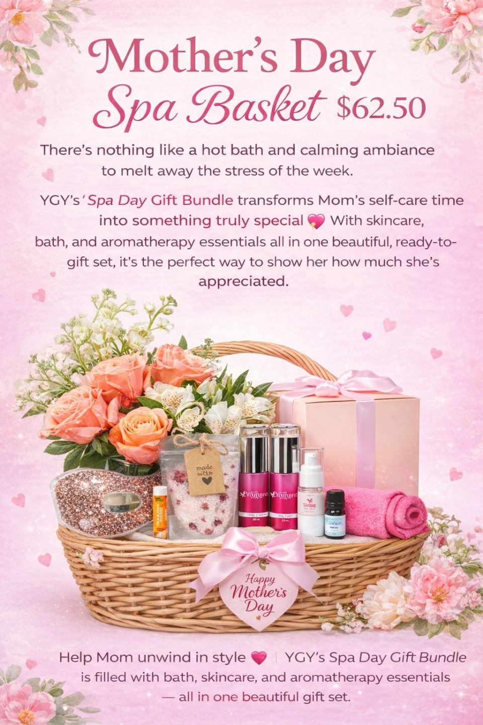 YGY's Spa Day Gift Bundle includes skincare, bath, and aromatherapy essentials. It's a beautiful, ready-to-gift set designed to help Mom unwind. This all-in-one gift set offers bath, skincare, and aromatherapy items.