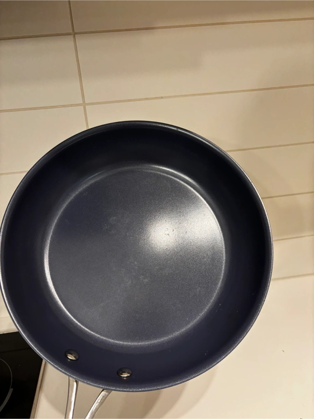 Two Zwilling frying pans with dark blue interiors and stainless steel handles. These pans are good for everyday cooking needs.