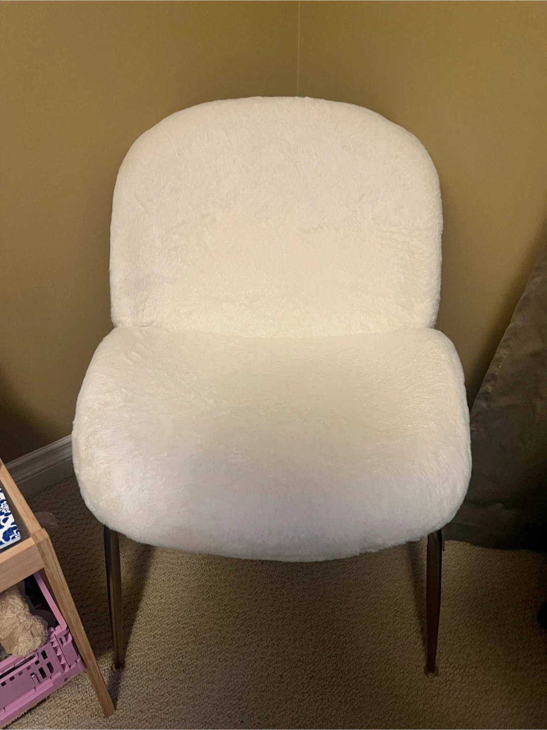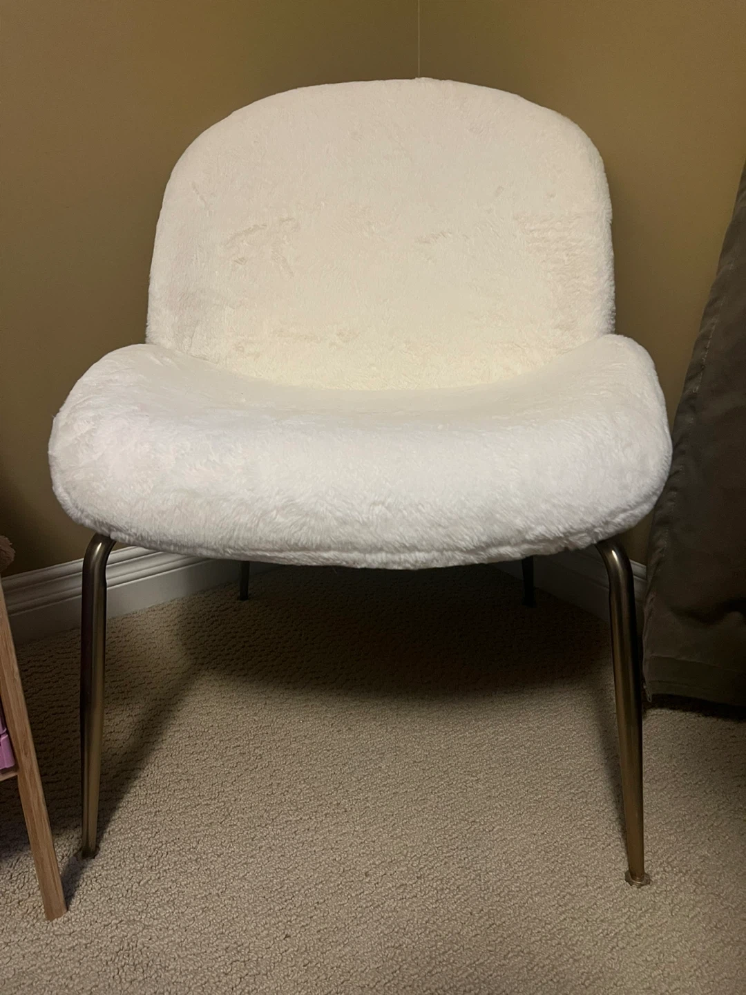 Comfy accent chair with a fluffy cream sherpa/brushed fur upholstery from Structube. It's 24” wide, 17” high from the seat, 27” tall from the very bottom.
