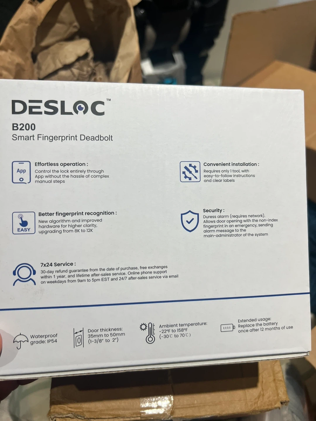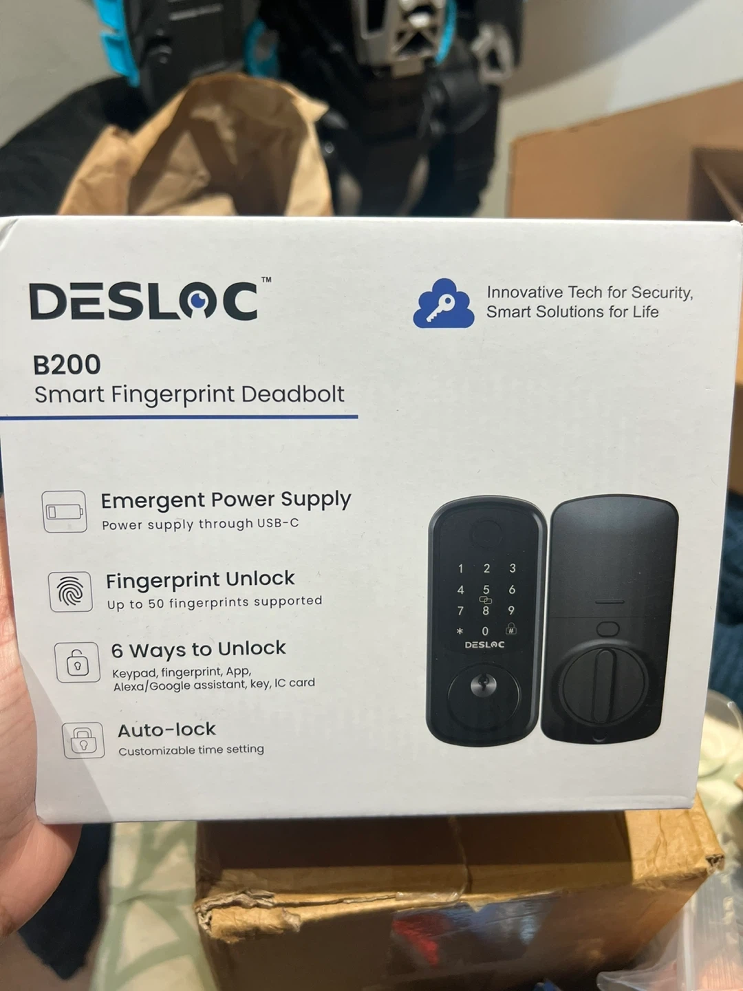 This is a DESLOC B200 Smart Fingerprint Deadbolt in black. It offers fingerprint unlock for up to 50 fingerprints and has 6 ways to unlock. It also features emergent power supply via USB-C and auto-lock functionality. Door thickness from 35mm to 50mm.