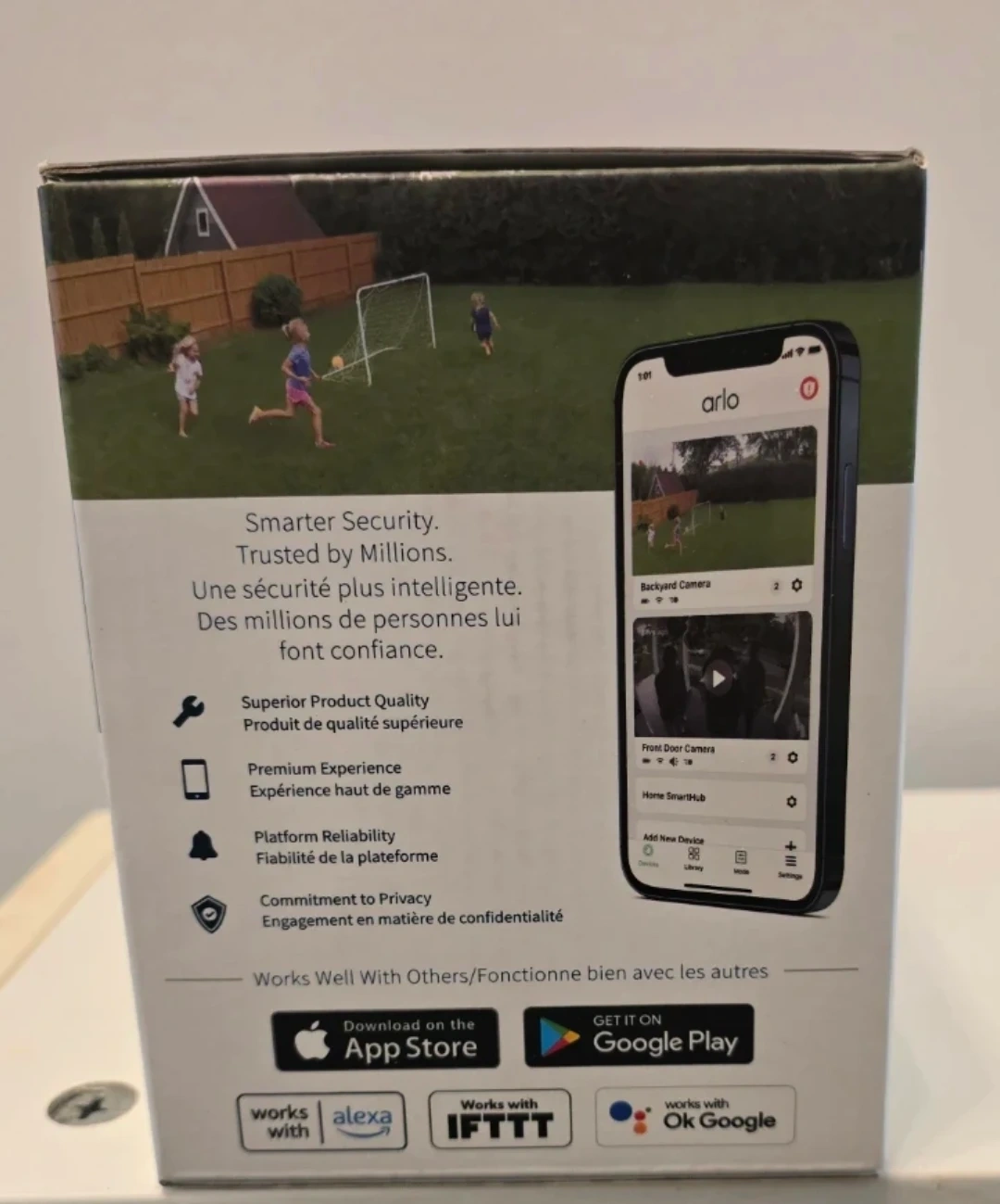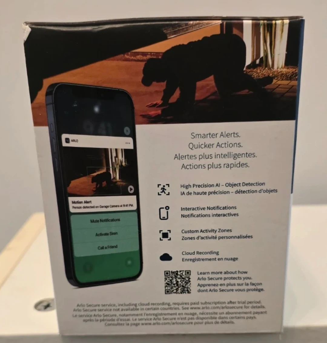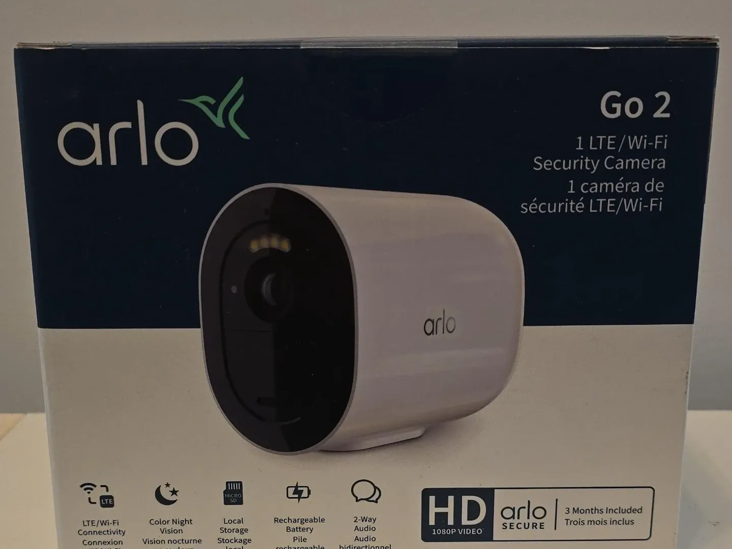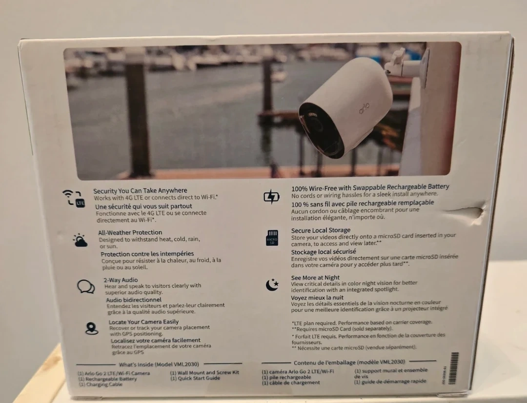 Arlo Go 2 security camera. It's LTE/Wi-Fi enabled with 1080P video. Features color night vision and a rechargeable battery. Includes 3 months of Arlo Secure. On open box.