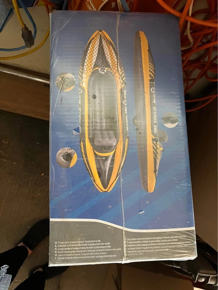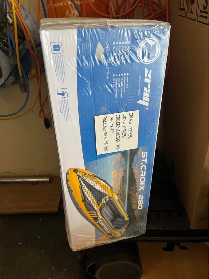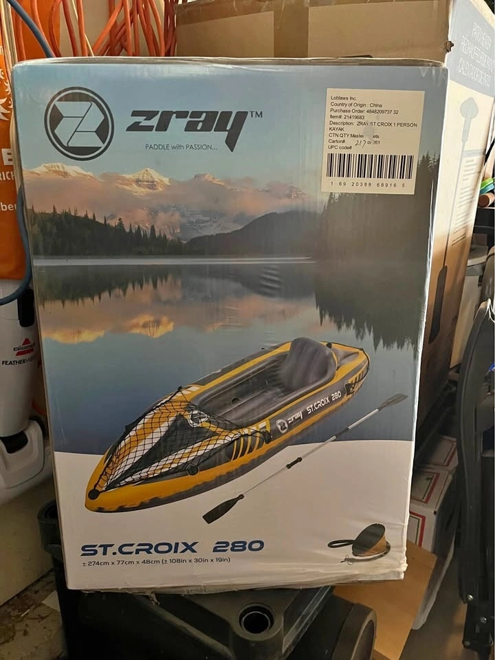 Brand new Zray ST.CROIX 280 inflatable 1-person kayak. Still in original box, sealed. Comes with a paddle and pump. Kayak is 108in x 30in x 19in.