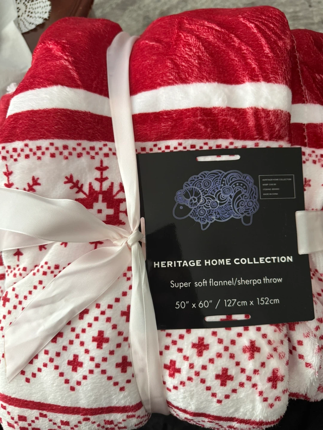 *Brand new* This super soft flannel/sherpa throw from Heritage Home Collection is a cozy addition to any home. It measures 50" x 60" (127cm x 152cm) and features a festive red and white snowflake pattern. Perfect for snuggling up on a cold day!