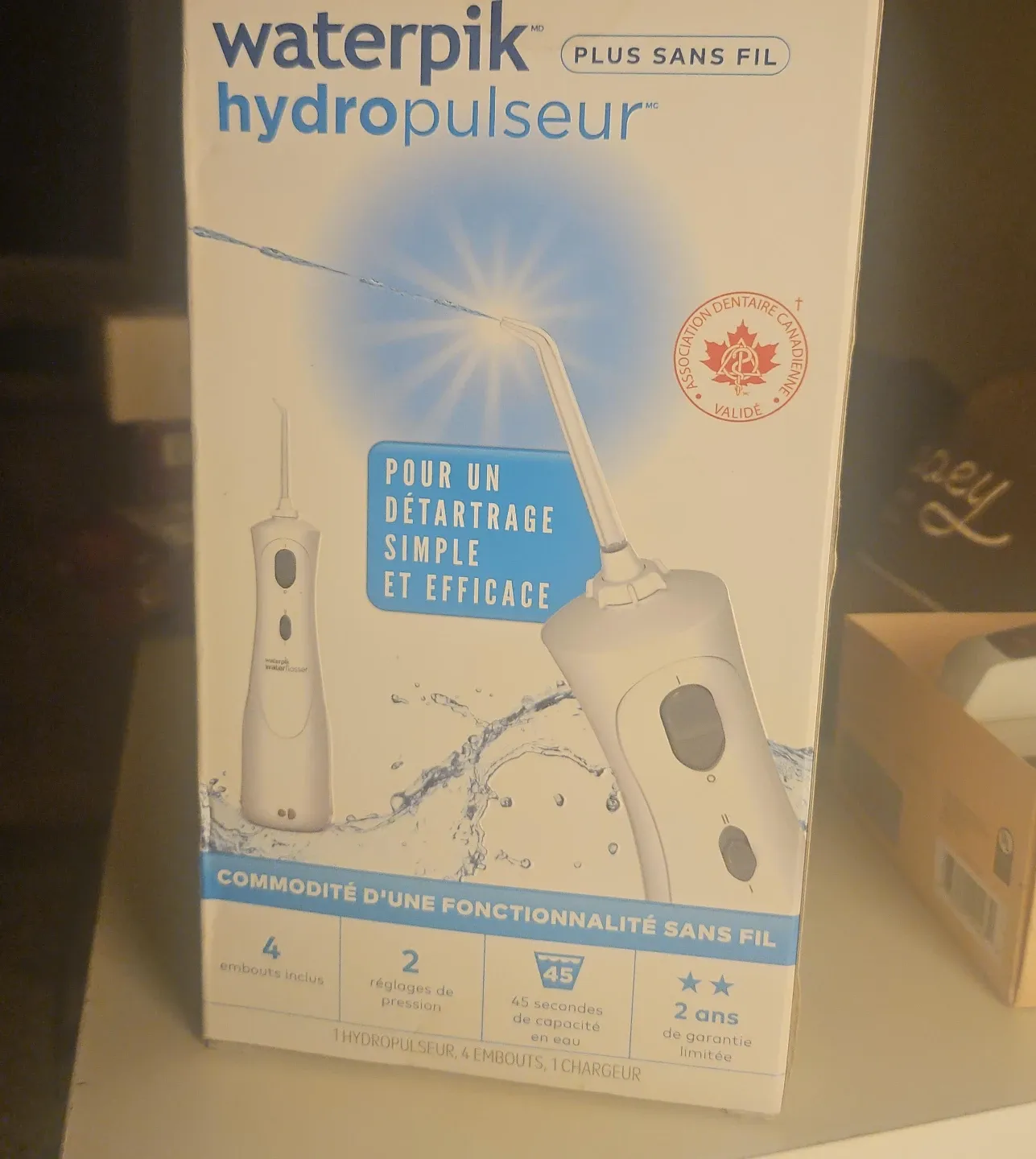 Waterpik cordless water flosser, comes with 4 tips and 2 pressure settings. It has a 45-second water capacity and is rechargeable. Ergonomic non-slip grip and easy-to-fill reservoir.