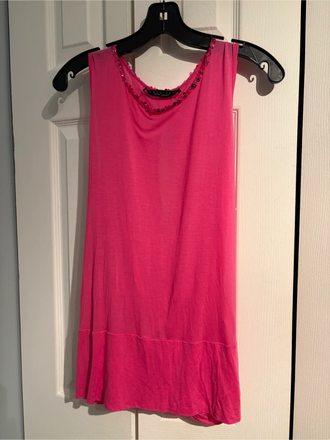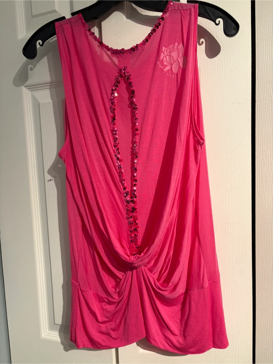A bright pink sleeveless top featuring sparkling sequin embellishments around the neckline and a draped back detail. It's made from a lightweight, flowy material. This top would be great for a night out!