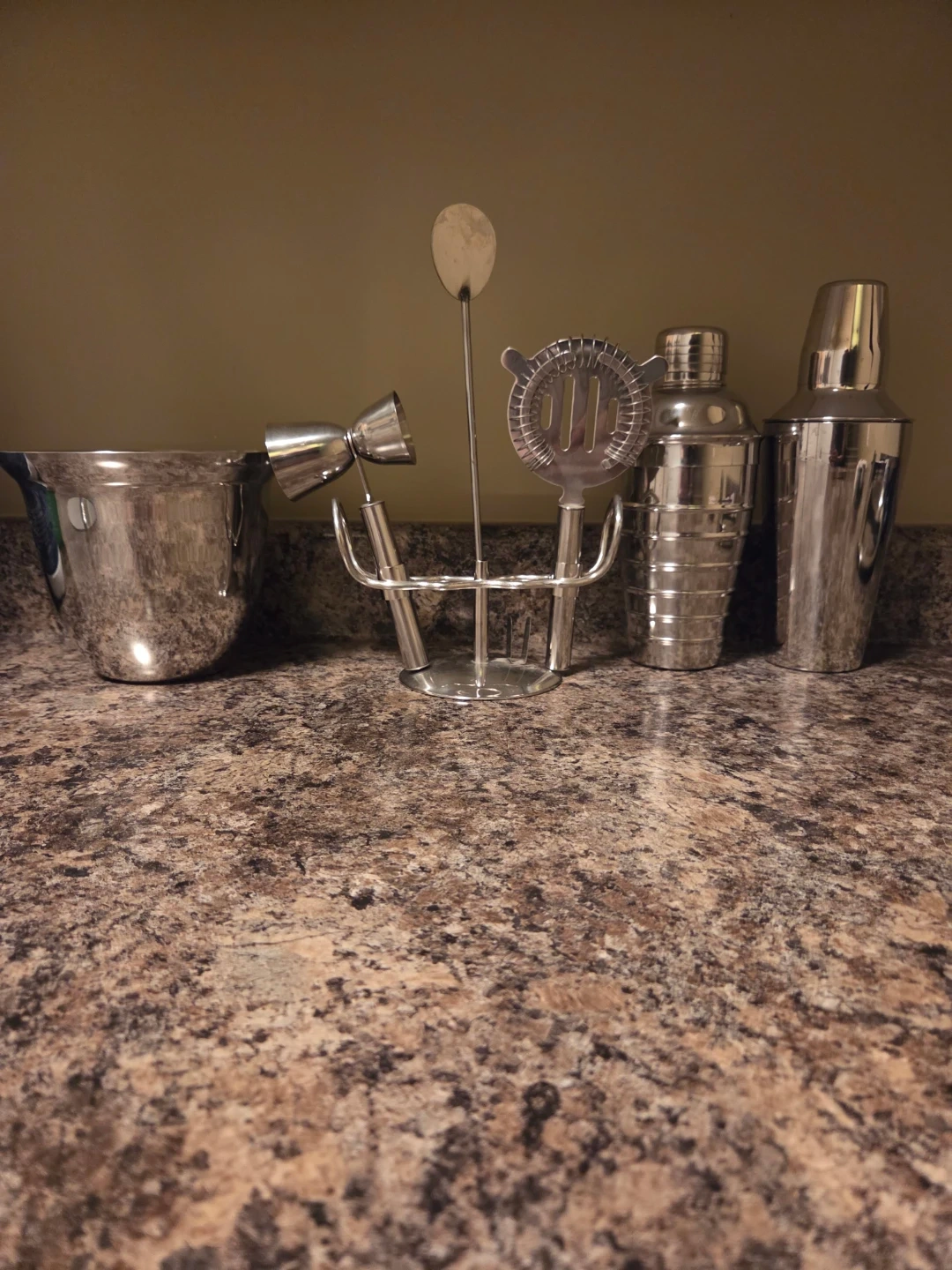 This bar tool set includes two shakers, a strainer, a jigger, and a mixing spoon. All tools are made from durable stainless steel and come with a convenient stand for storage. It's perfect for making your favourite drinks at home! Also a Ice Bucket.