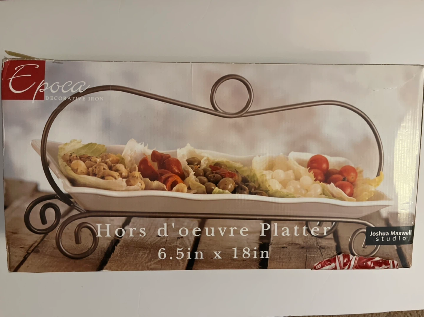 This Epoca hors d'oeuvre platter is made of decorative iron and ceramic. It measures 6.5 inches by 18 inches. Perfect for serving snacks and appetizers!