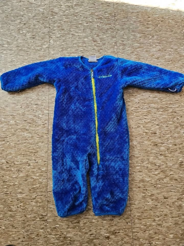 *CAR SEAT SAFE* Columbia Shark Trek Interchange Bunting one piece winter snowsuit. bright blue & navy with yellow asymmetrical zip for easy on, easy off.