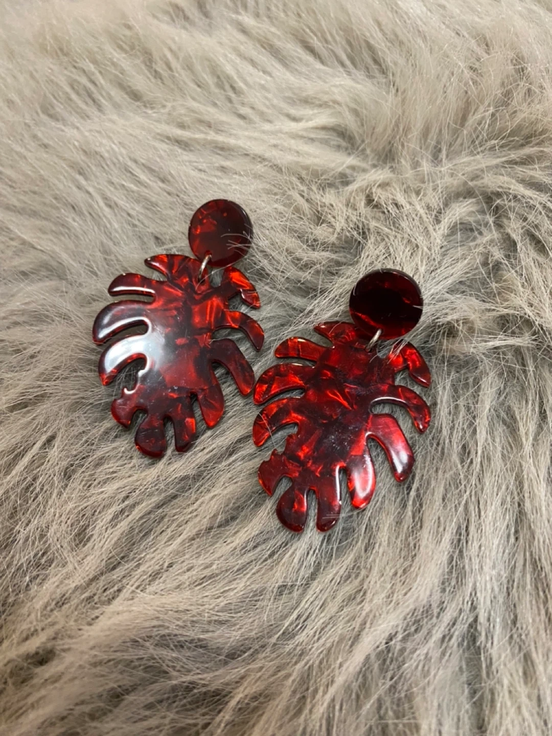 These fun leaf-shaped dangle earrings come in a striking red marbled pattern. They're lightweight and add a pop of colour to any outfit. Perfect for someone who loves nature-inspired accessories!