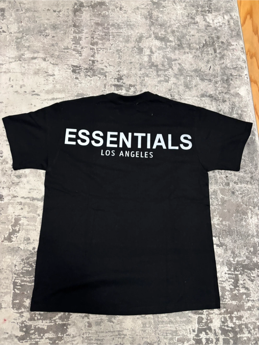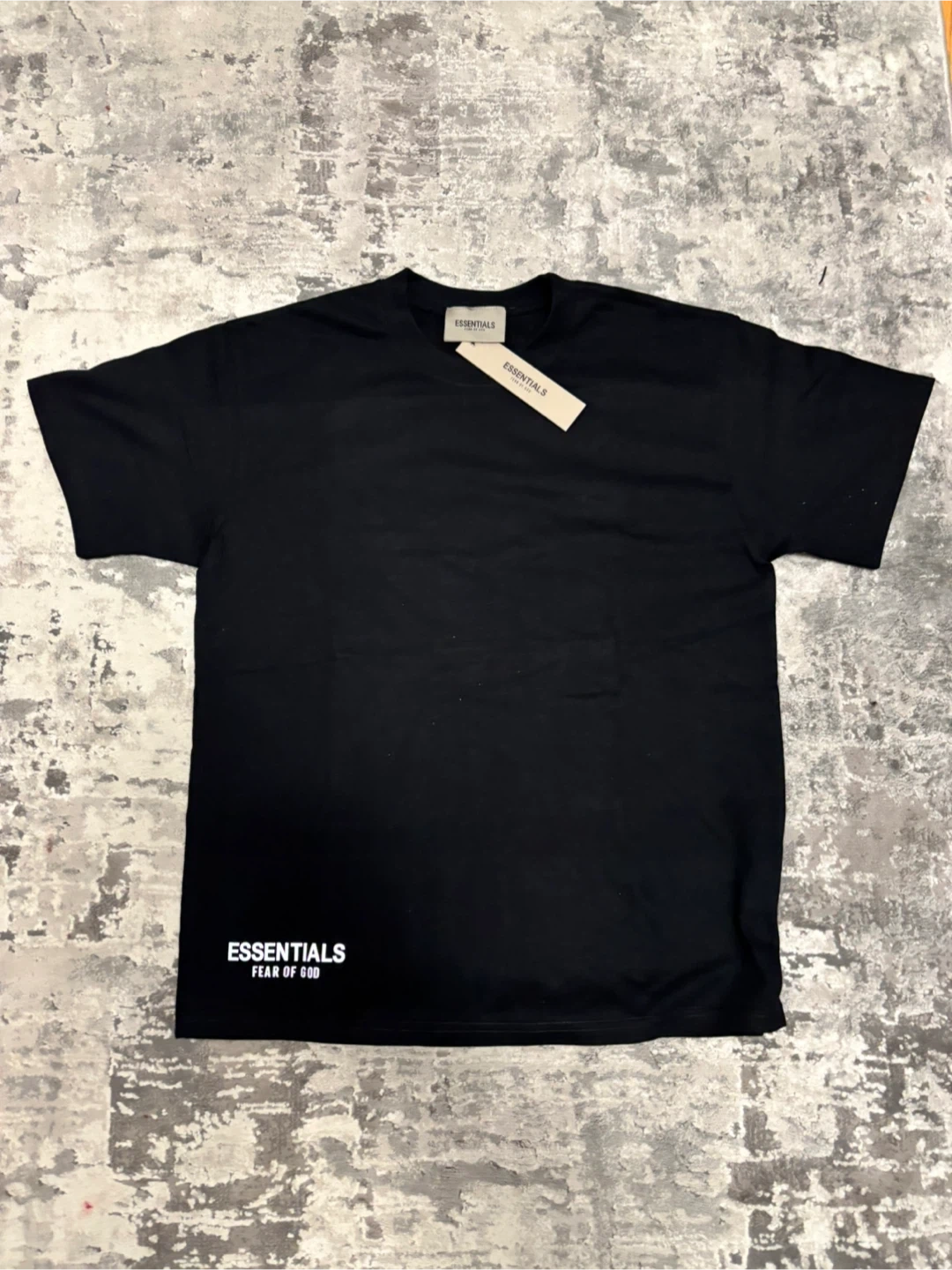 This is a black t-shirt from Fear of God Essentials. It features reflective 'ESSENTIALS' branding on the back and a smaller logo on the front hem. This shirt is made from a comfortable fabric.