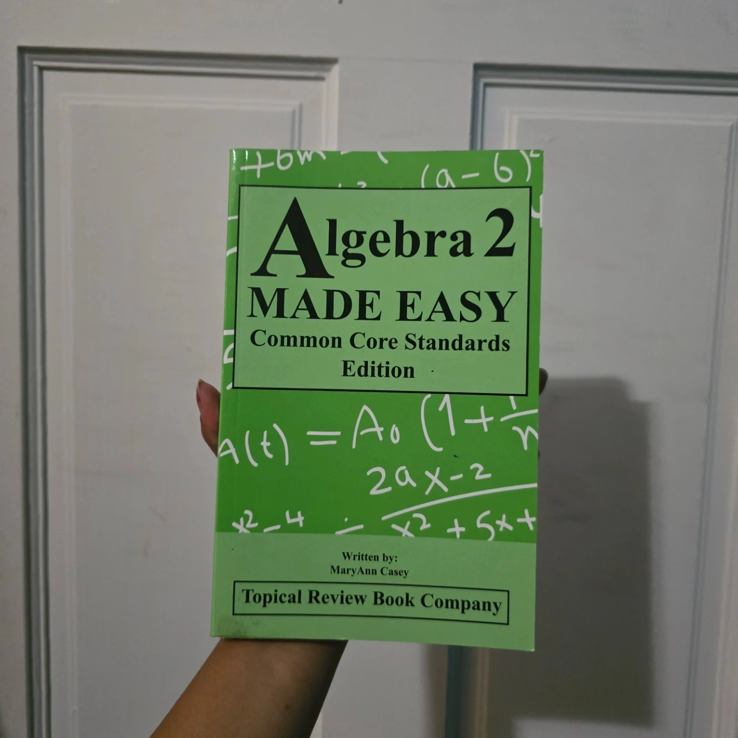 This is the Algebra 2 Made Easy textbook, Common Core Standards Edition. It's written by MaryAnn Casey and published by Topical Review Book Company. This book covers essential algebra concepts.