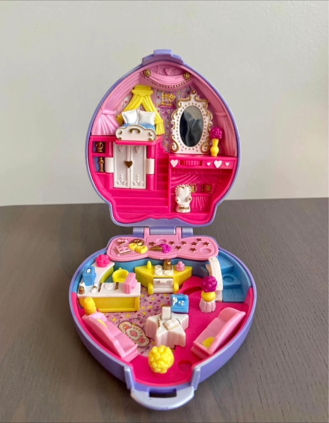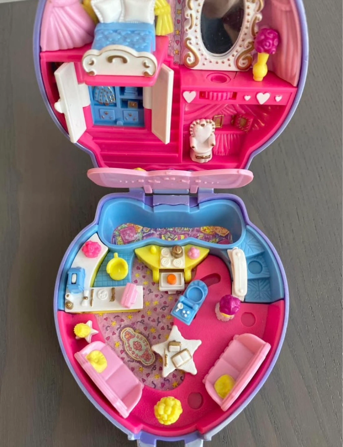 This is a vintage Polly Pocket compact made by Bluebird Toys in 1995. It features a heart-shaped design and opens to reveal a detailed miniature playset. The compact is purple with a pink bow accent.