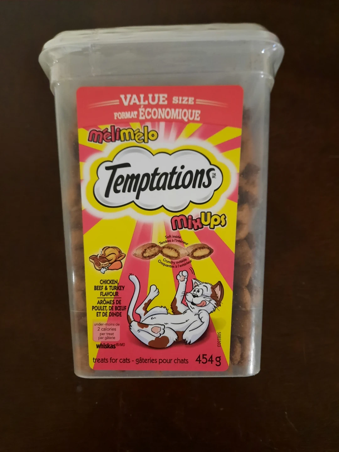This value size container holds Temptations MixUps cat treats. It's a chicken, beef & turkey flavour with soft inside and crunchy outside. These treats are under 2 calories per treat!