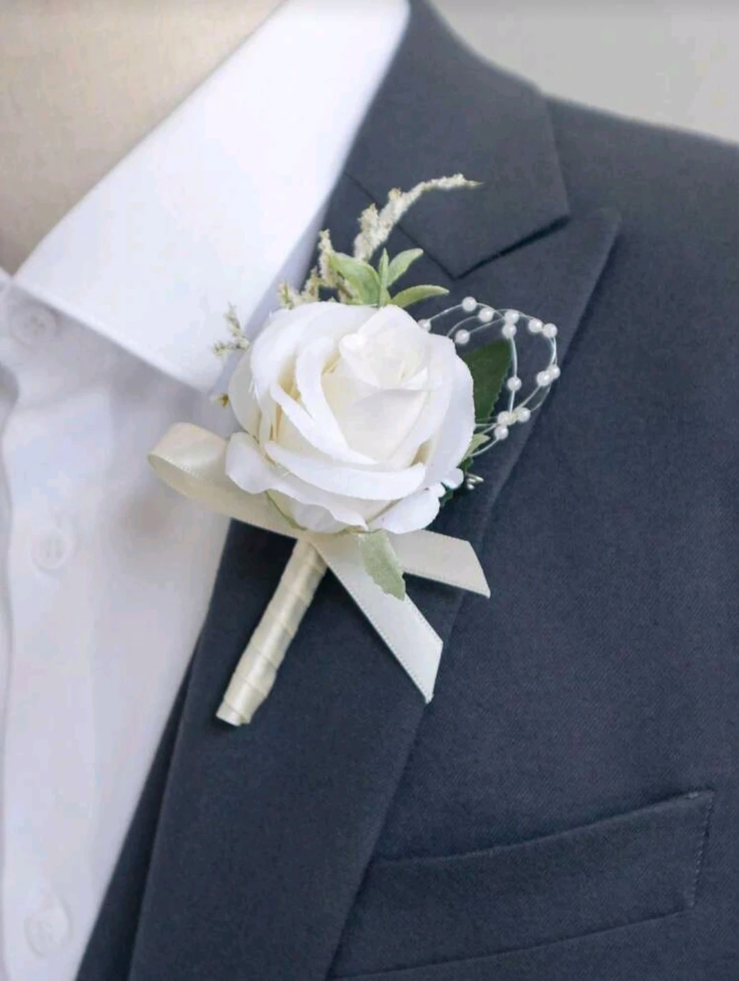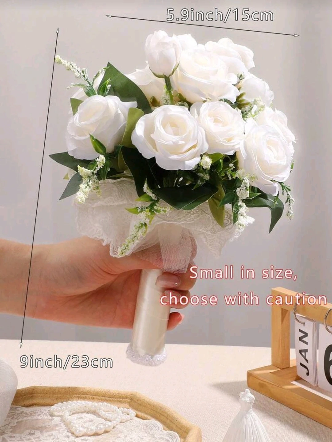 This set includes a white rose boutonniere and a small white rose bouquet, perfect for weddings or special occasions. The bouquet measures 5.9 inches (15cm) in diameter and 9 inches (23cm) in length. These artificial flowers are a lovely touch for formal events.