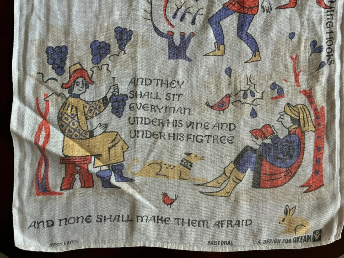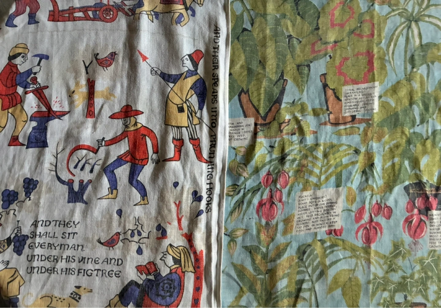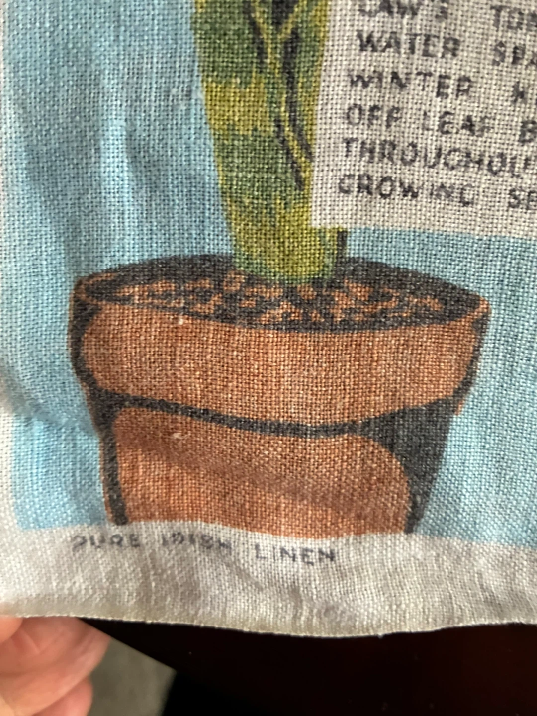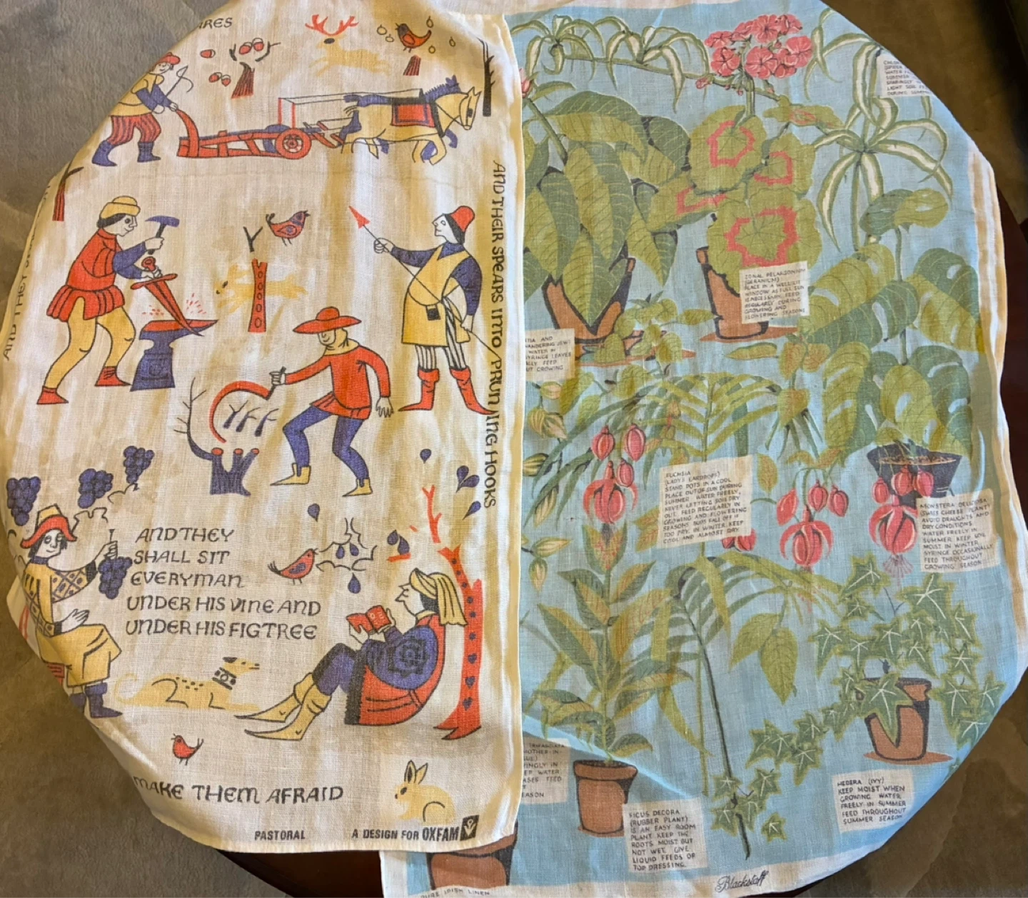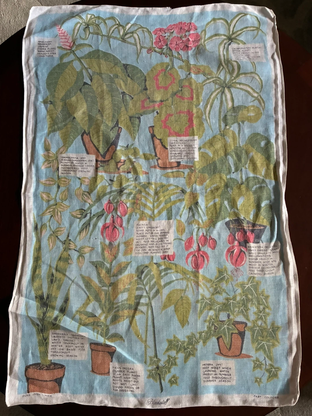 $5 Vintage iris linen tea towel 1960s 1970s oxfam peace indoor plants Donlands O'Connor