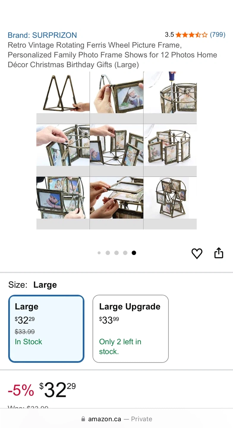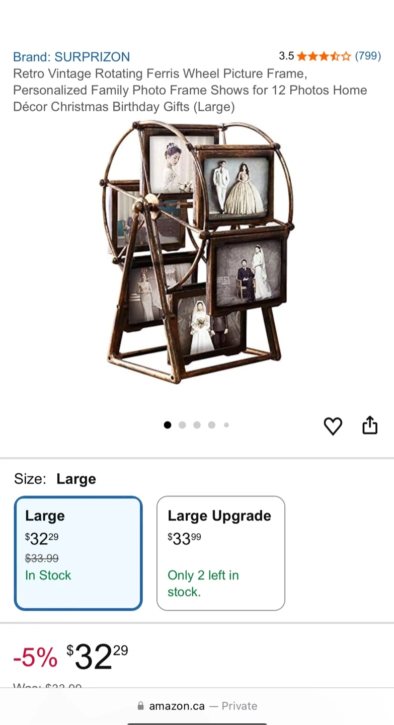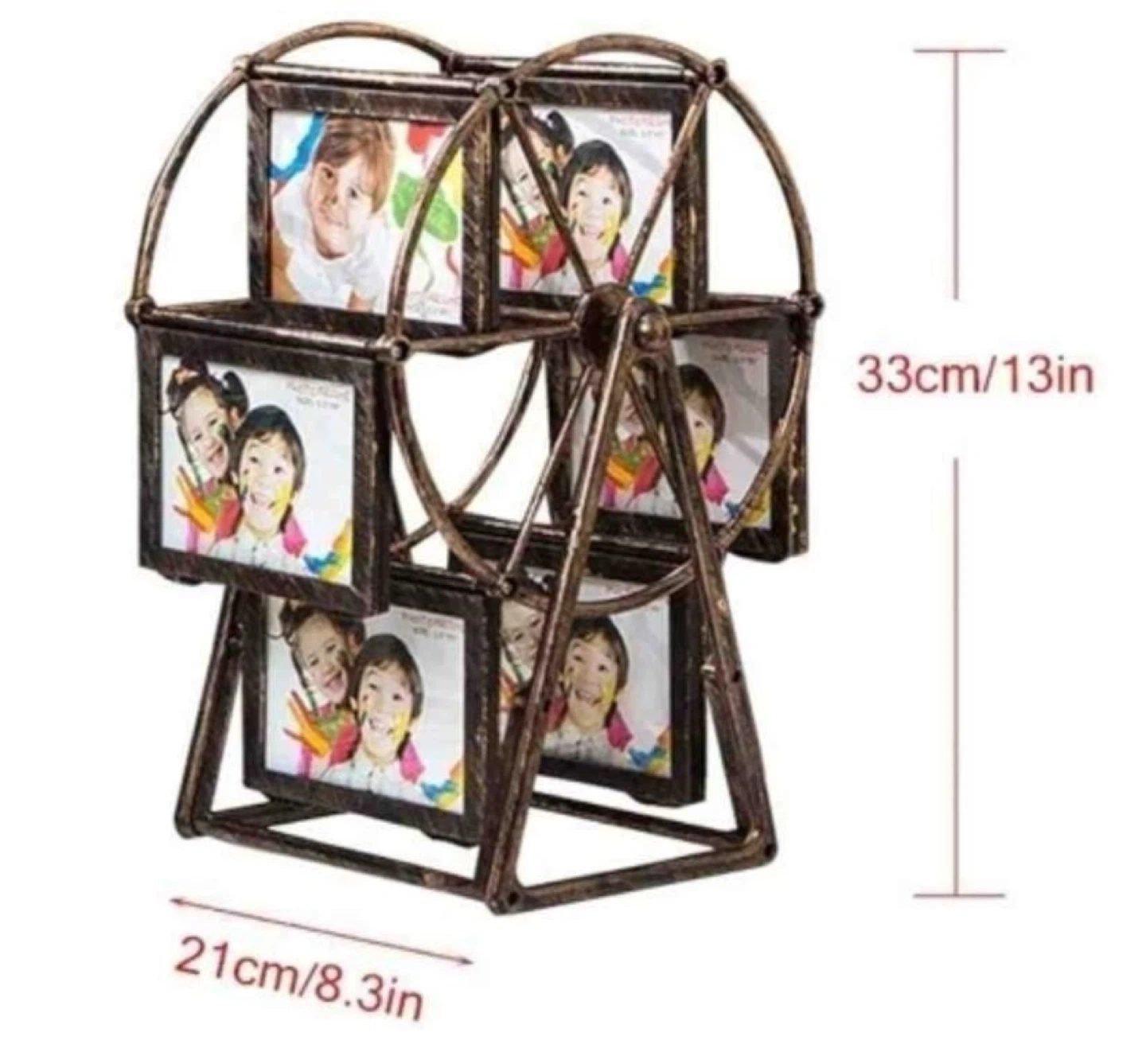 This SURPRIZON retro Ferris wheel picture frame holds 12 photos. It's made of metal with a vintage bronze finish. Dimensions are 21cm/8.3in wide and 33cm/13in tall. It displays family photos beautifully!