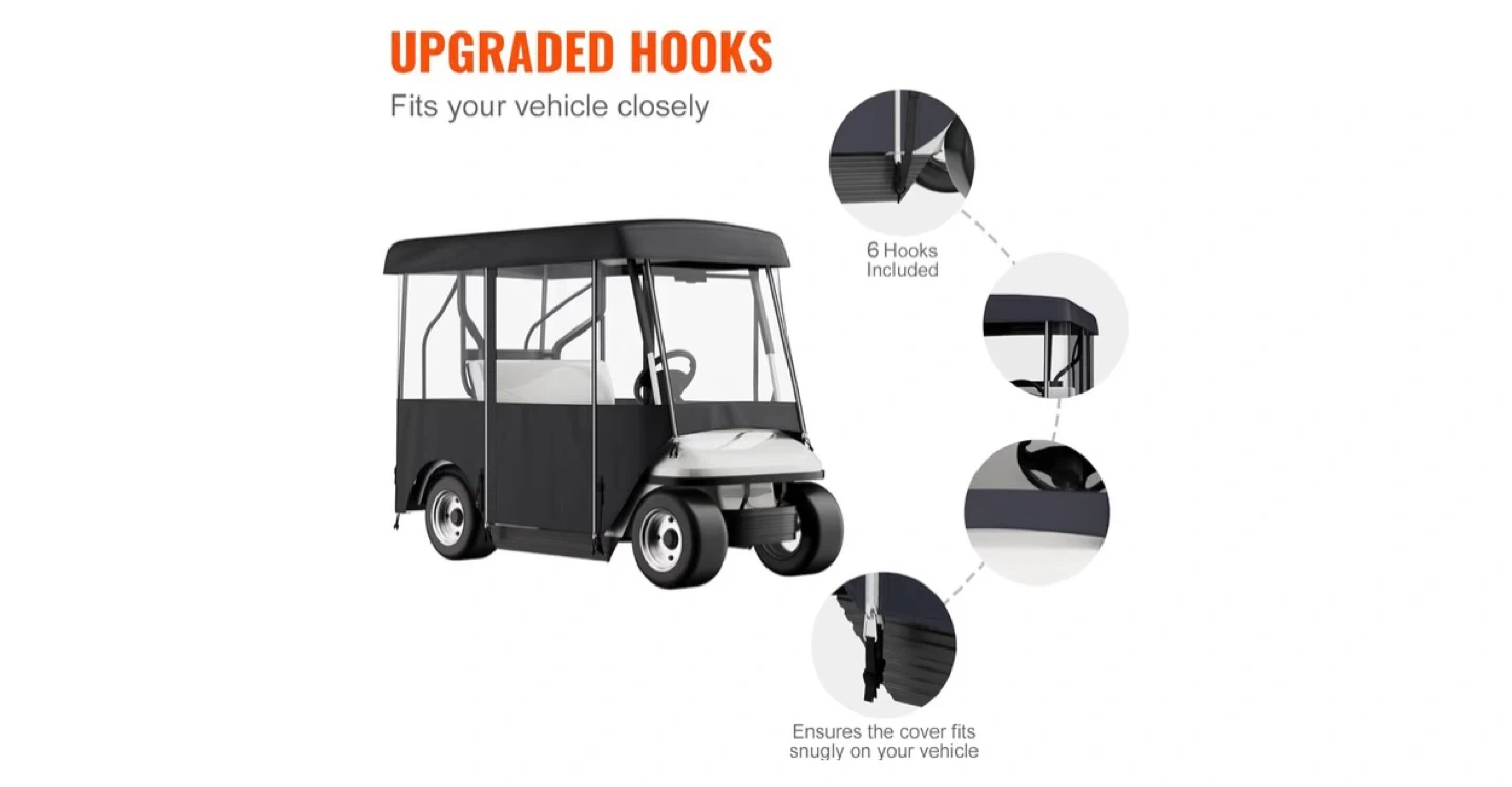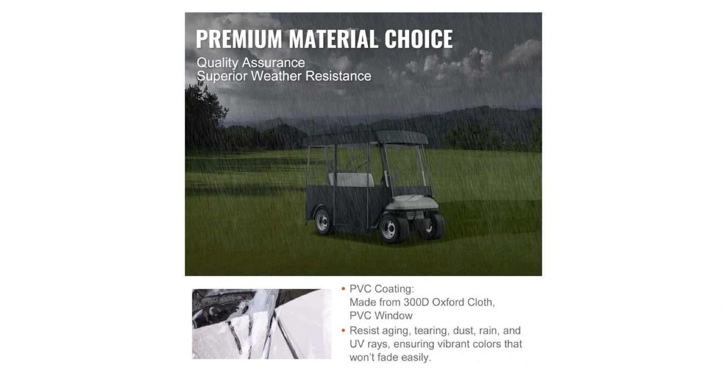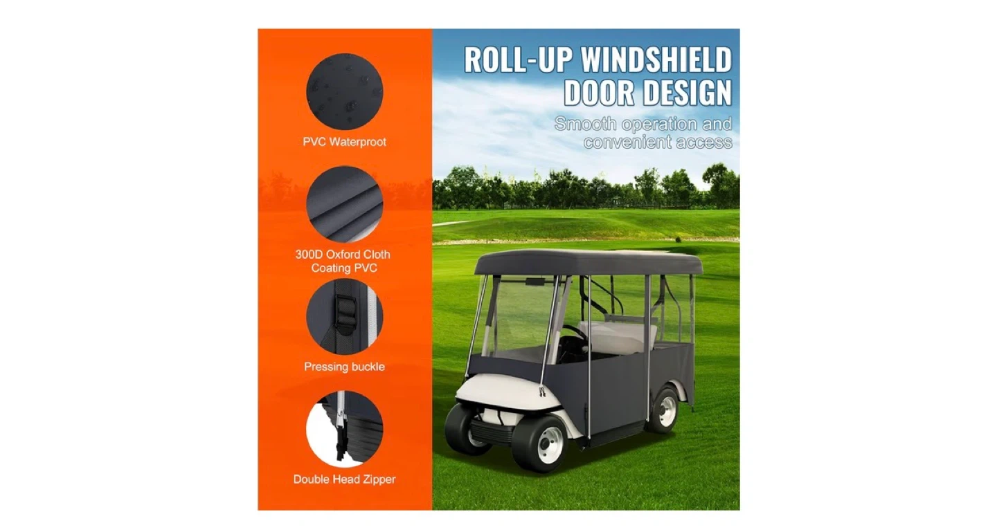This golf cart cover is made from 300D Oxford cloth with PVC coating and features a PVC window. It resists aging, tearing, dust, rain, and UV rays, ensuring vibrant colours that won't fade easily. It has a roll-up windshield door design for smooth operation and convenient access.