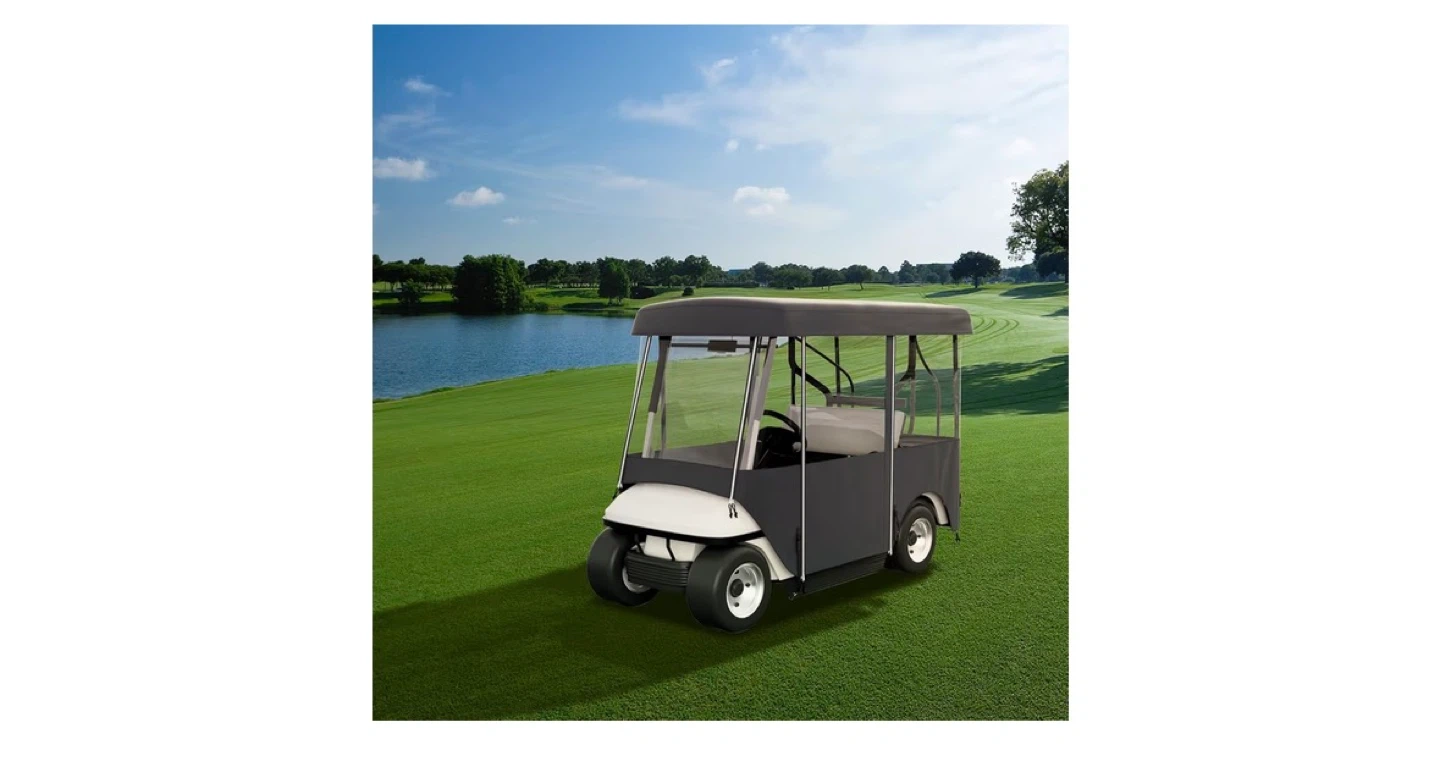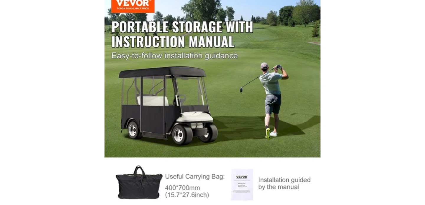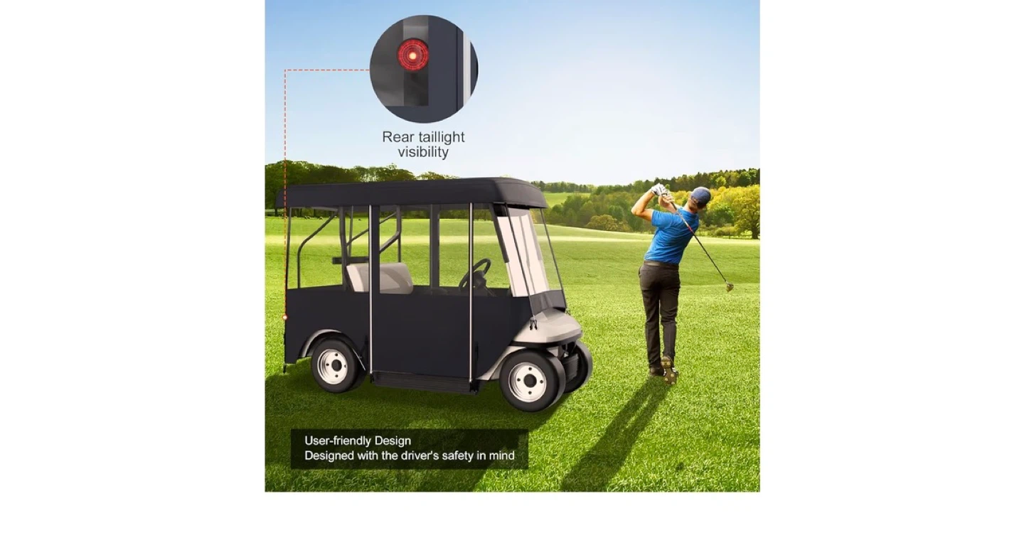 This golf cart cover is made from 300D Oxford cloth with PVC coating and features a PVC window. It resists aging, tearing, dust, rain, and UV rays, ensuring vibrant colours that won't fade easily. It has a roll-up windshield door design for smooth operation and convenient access.