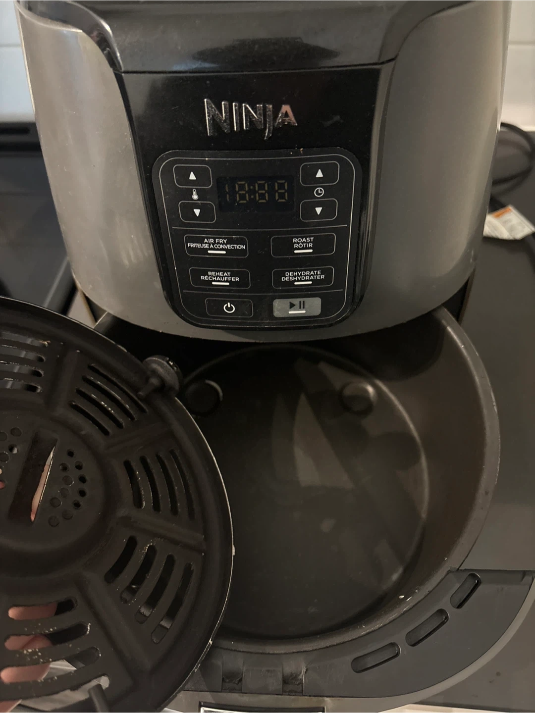 This is a Ninja air fryer. It has multiple functions including air fry, roast, and dehydrate. The basket and crisper plate are removable for easy cleaning.