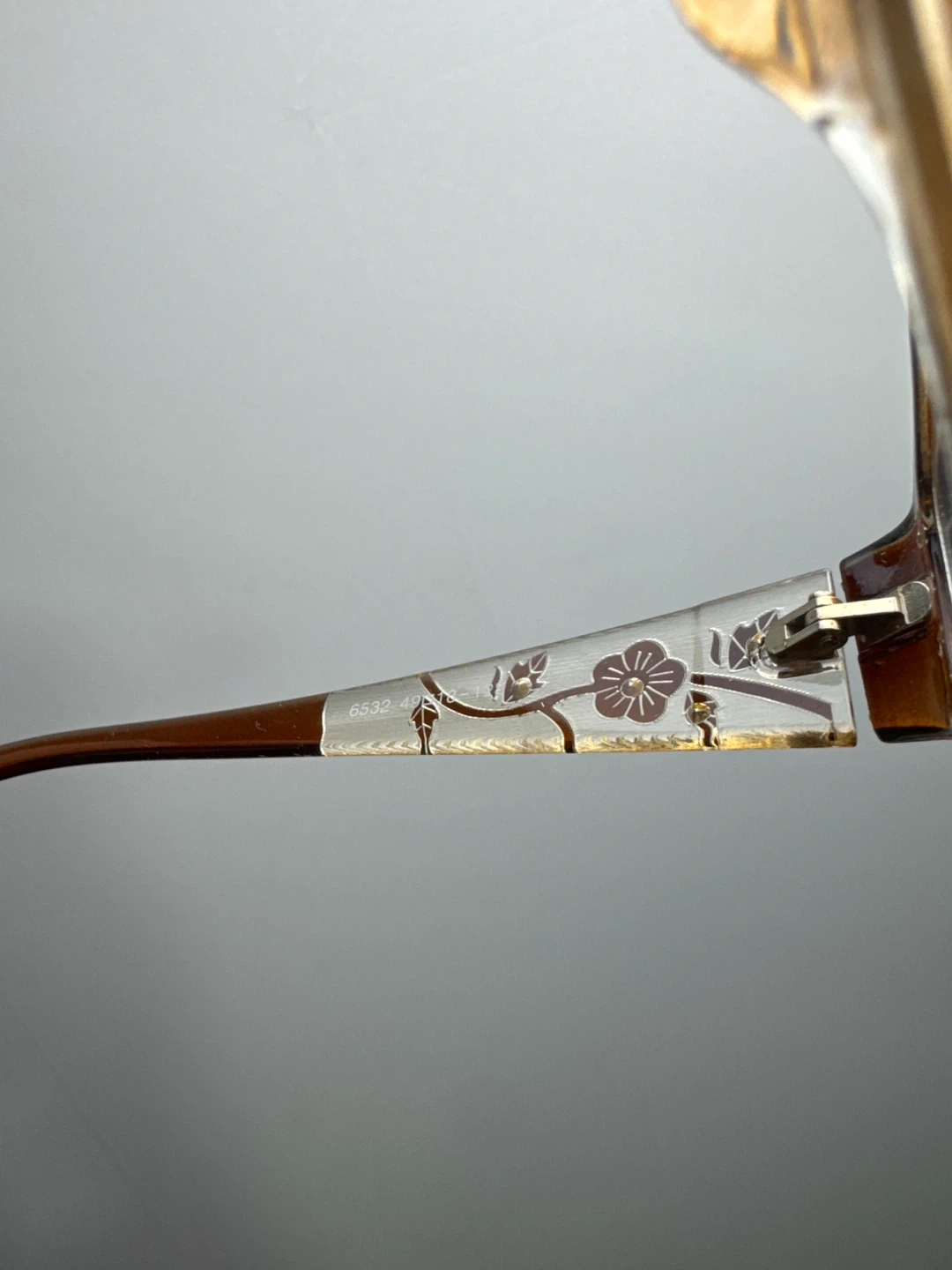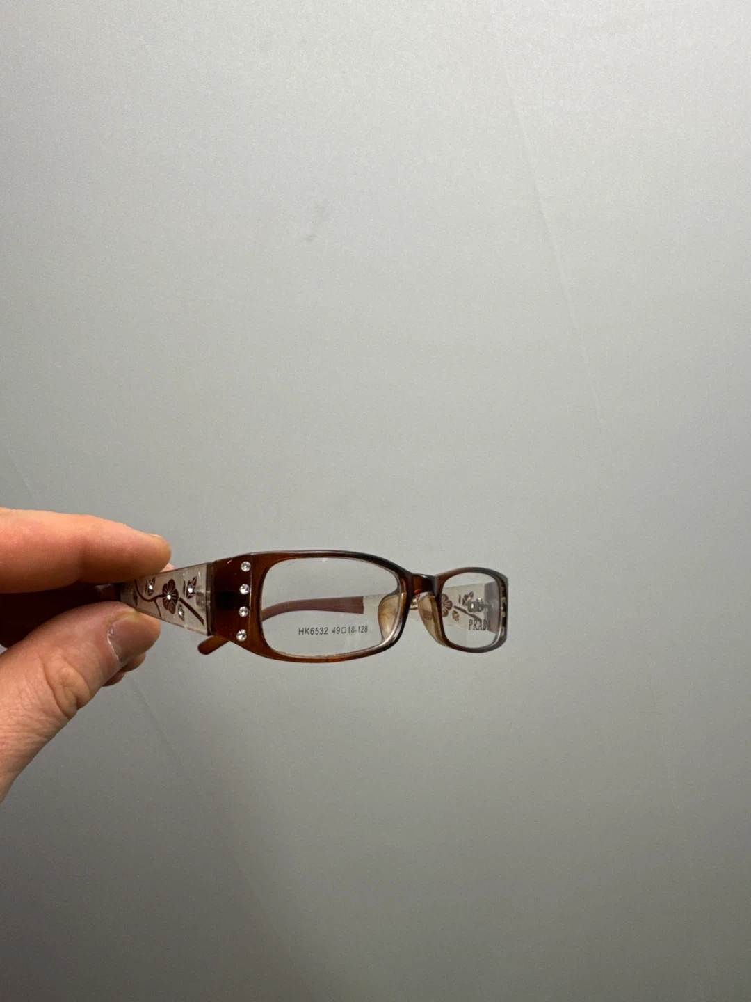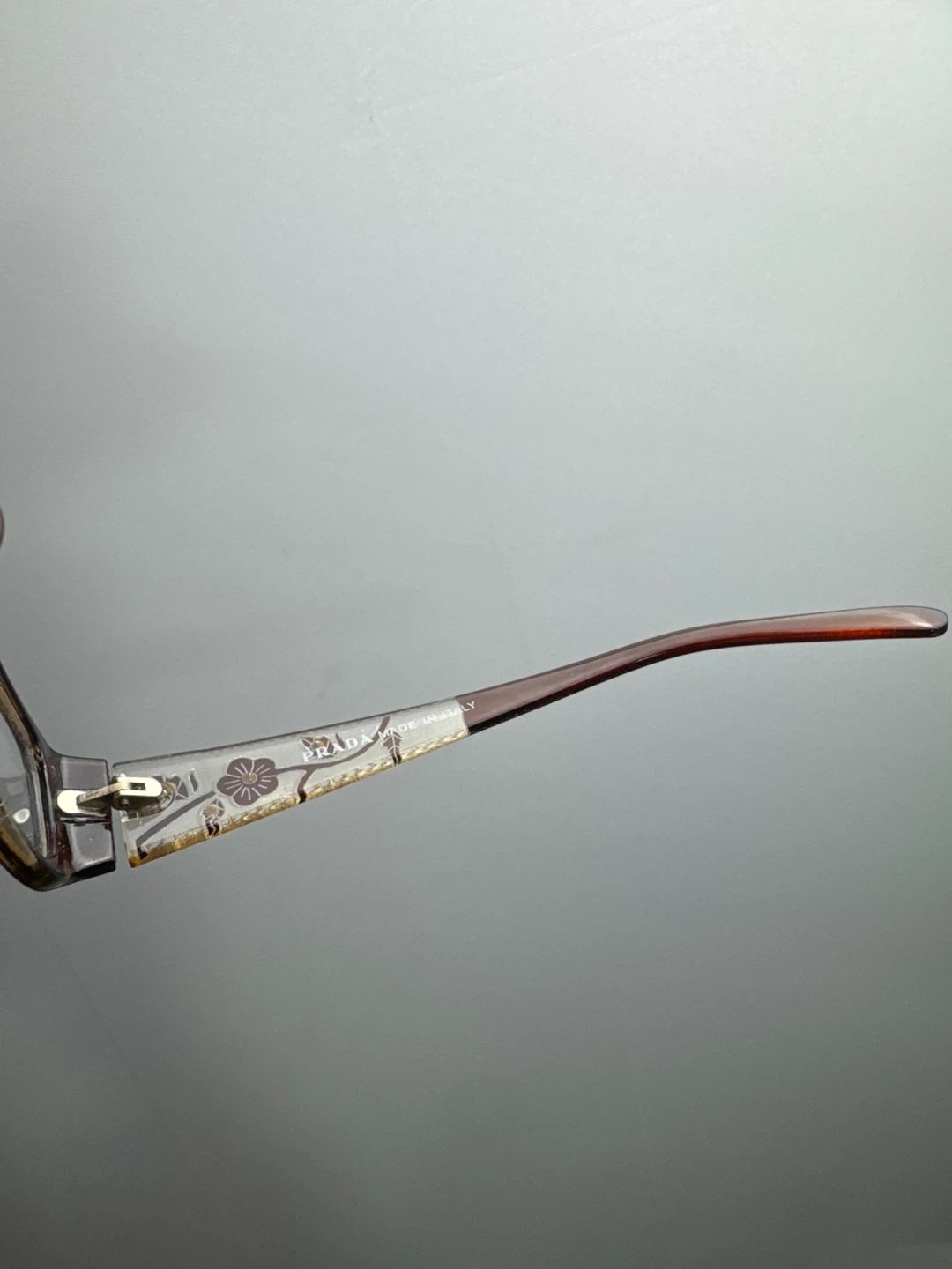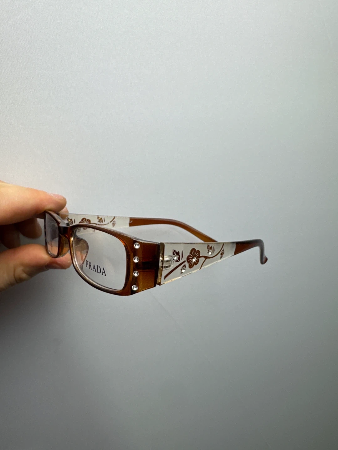 These are stylish Prada eyeglasses frames in a rich brown colour. They feature a delicate floral design along the temples and small decorative rhinestones. The frames are made in Italy.