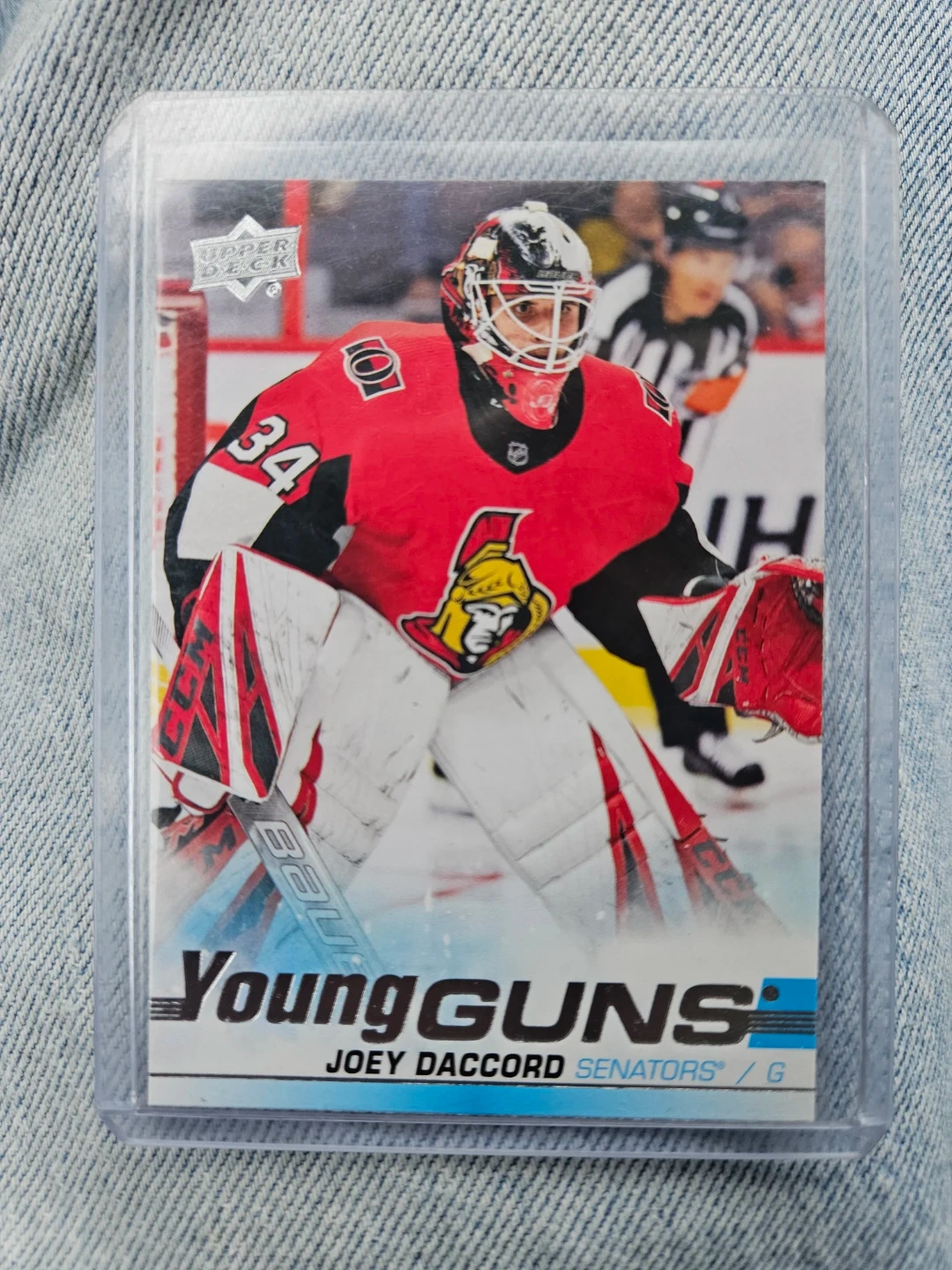 Selling a Joey Daccord Upper Deck Young Guns hockey card! This card features Daccord in his Senators gear. It's in great condition and would be a fantastic addition to any hockey card collection