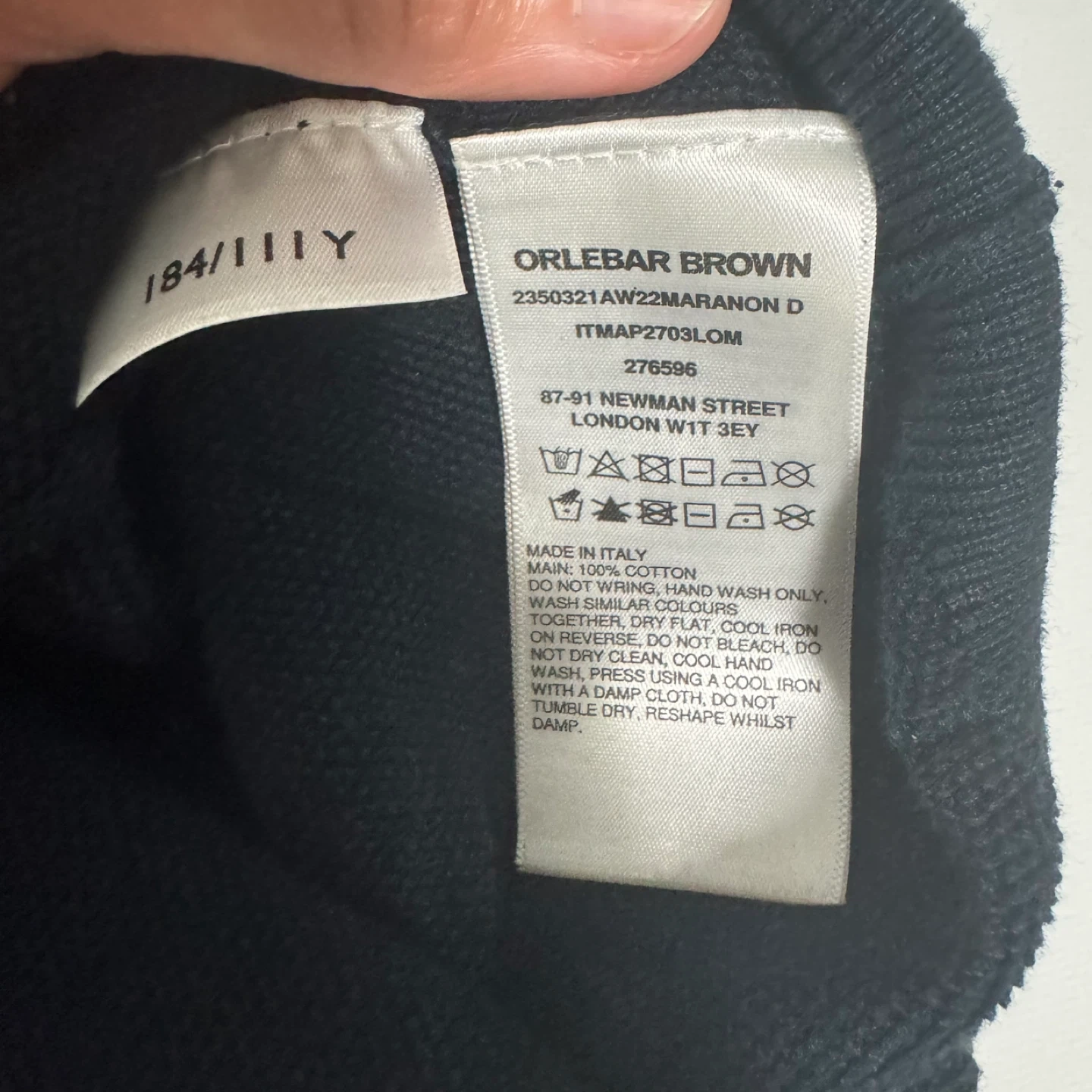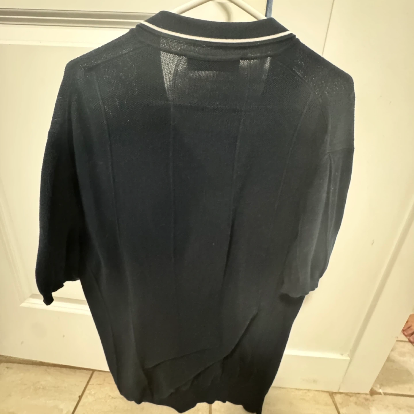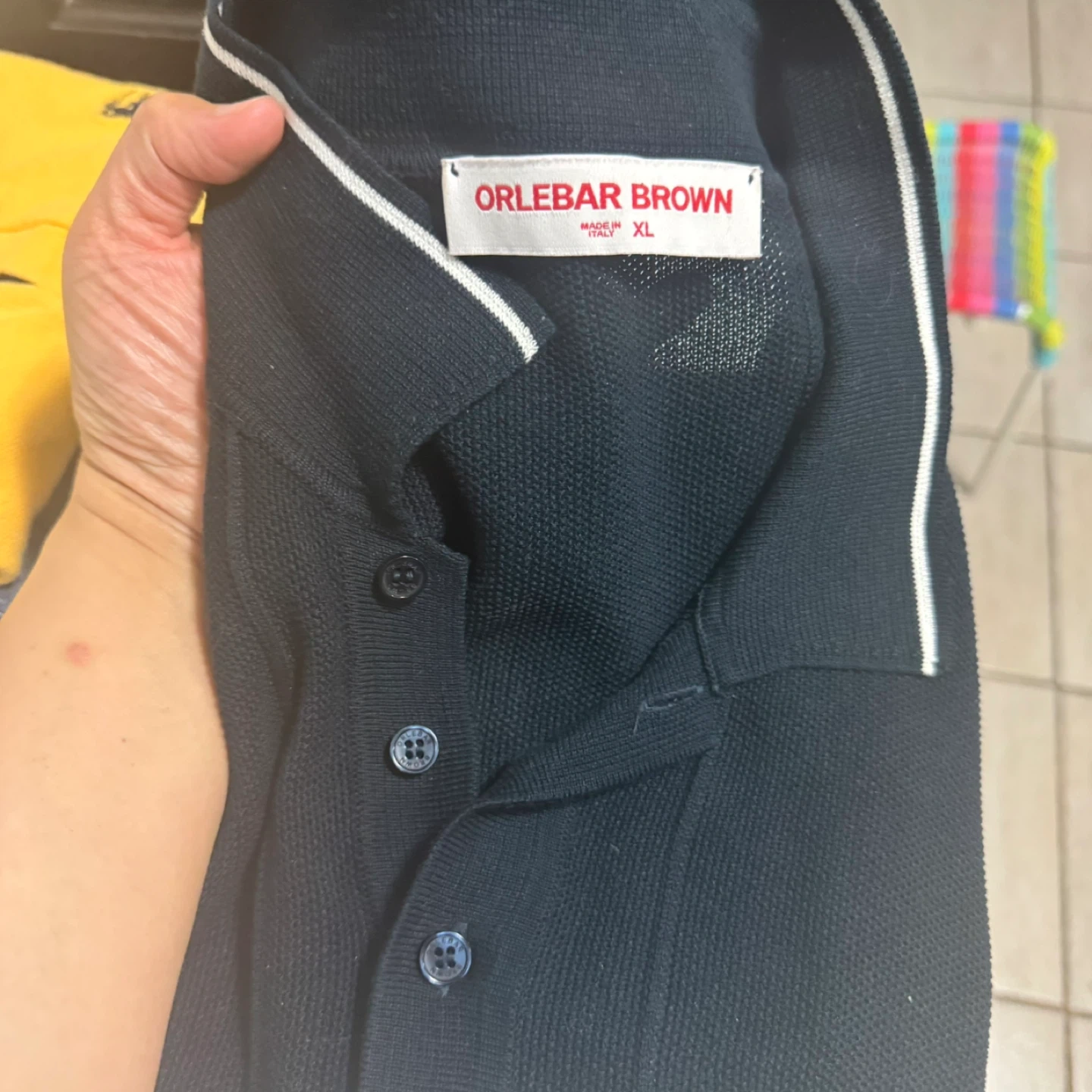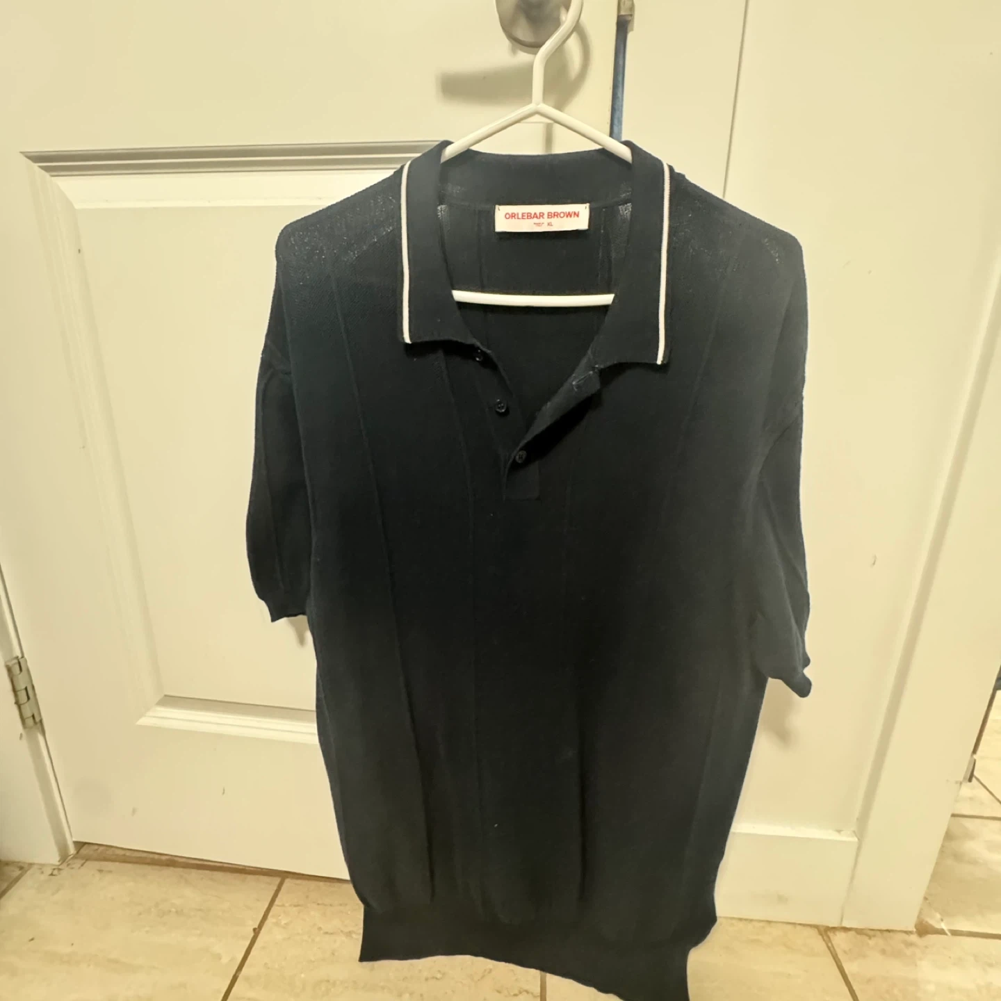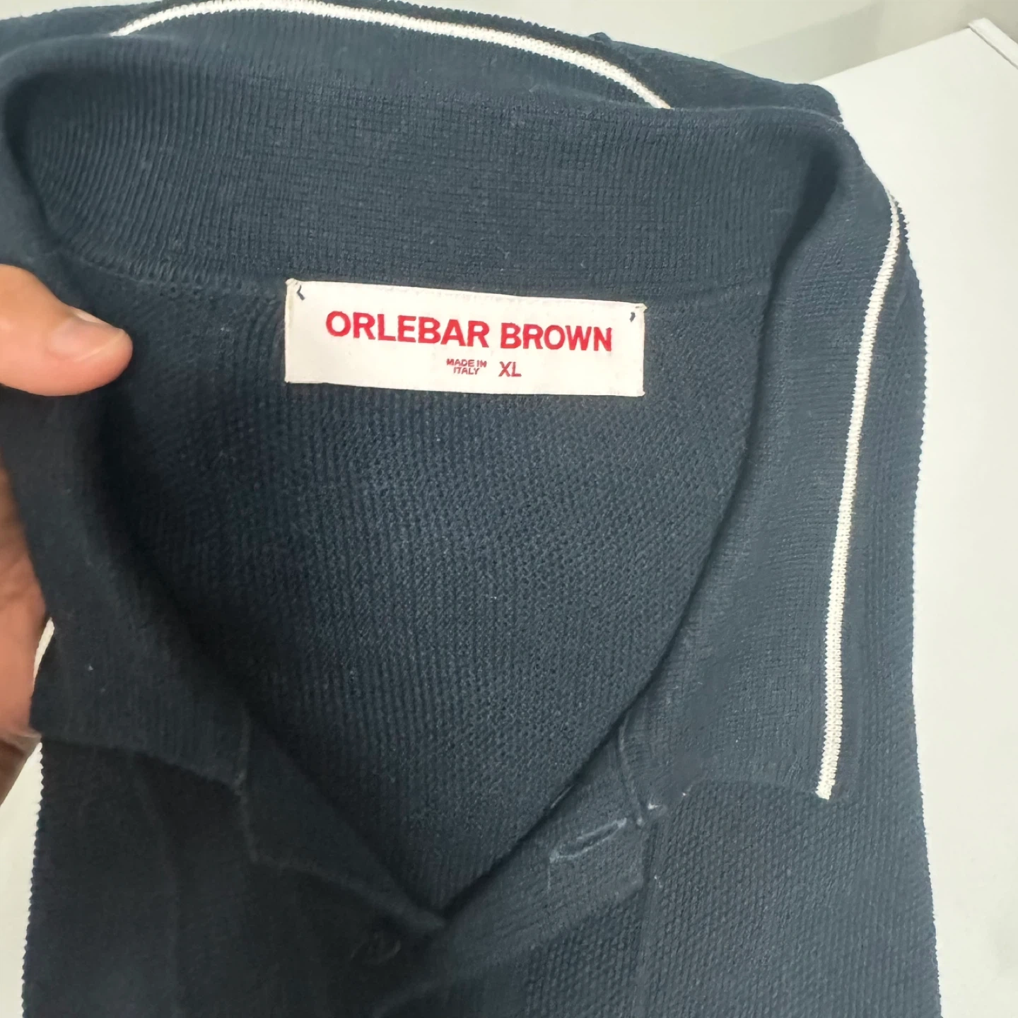 Orlebar Brown knit polo shirt in navy. Made in Italy, 100% cotton. Features a classic collar and button placket. Size XL.