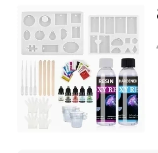 This resin kit includes two silicone molds with various shapes for creating pendants and charms. It comes with resin/hardener (4.28oz of each), mixing sticks, cups, gloves, and four different colours of glitter. Perfect for DIY jewelry making and crafts!