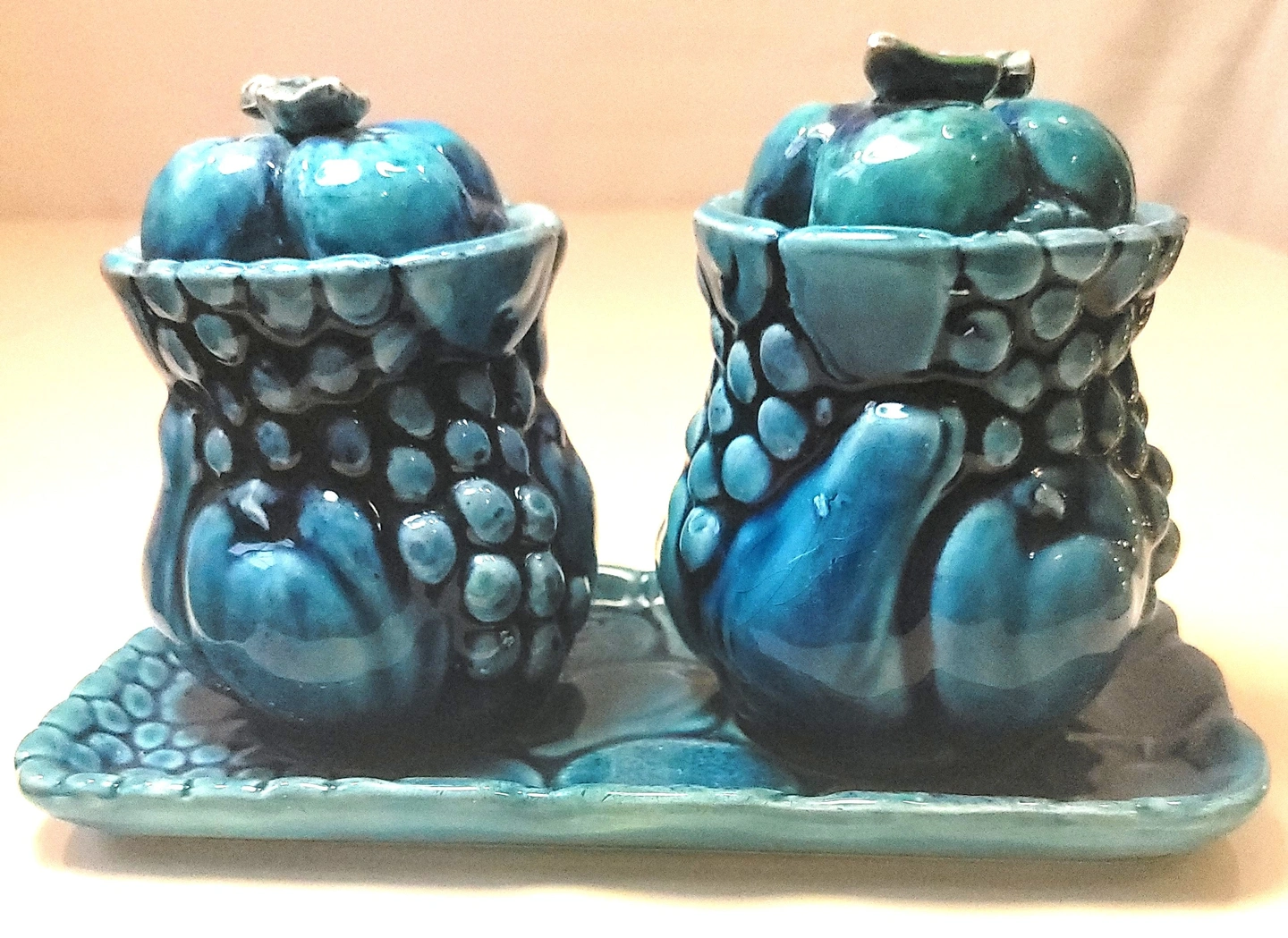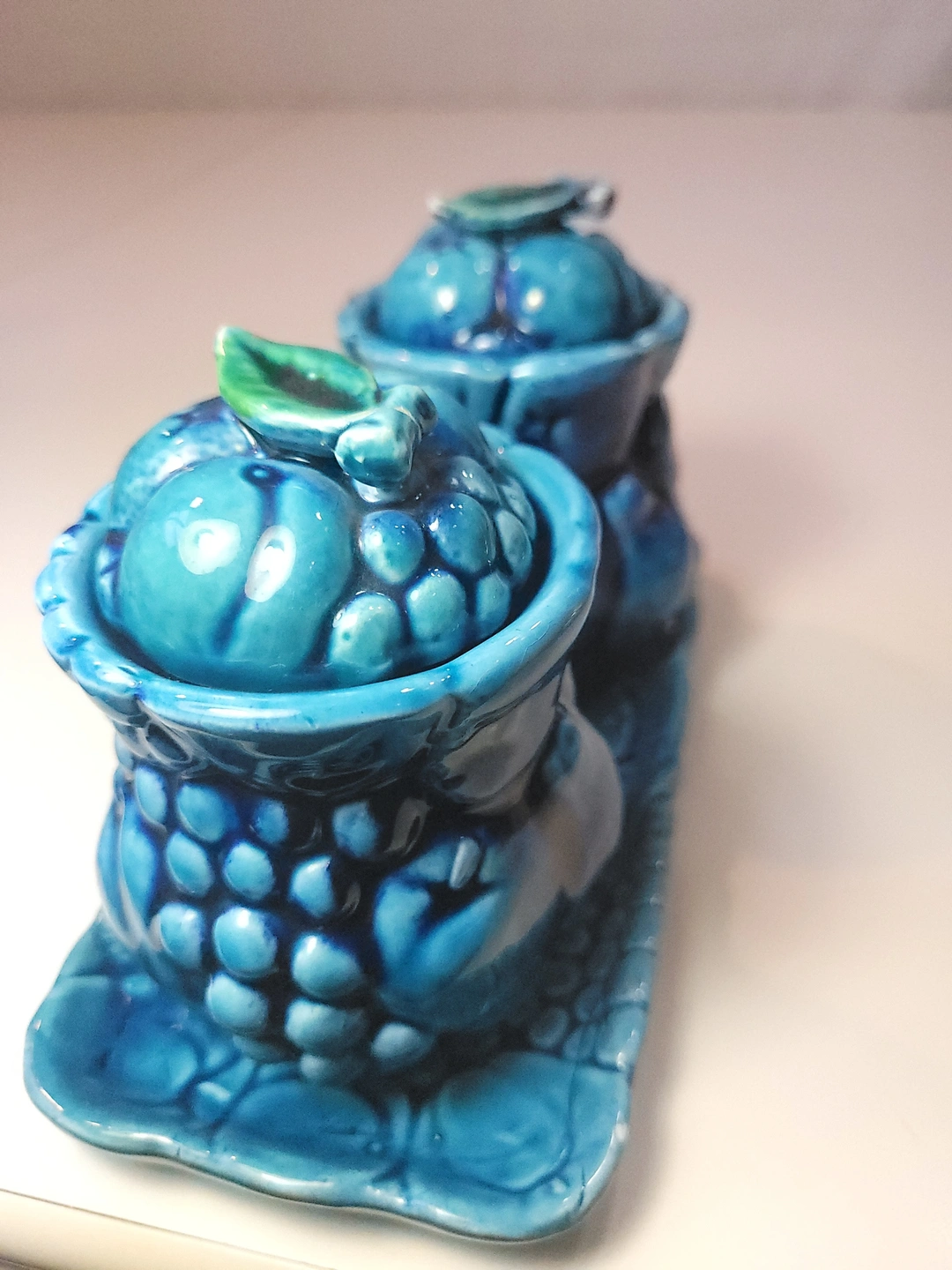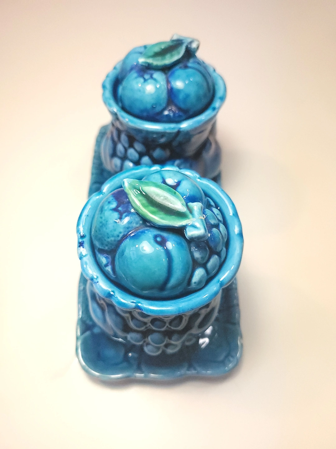 A classic piece of Mid-Century kitchenware, this Inarco "Mood Indigo" set (Design #E3322) features a high-gloss indigo blue glaze with embossed fruit motifs. This set is complete with both lidded jars and the original matching rectangular tray.