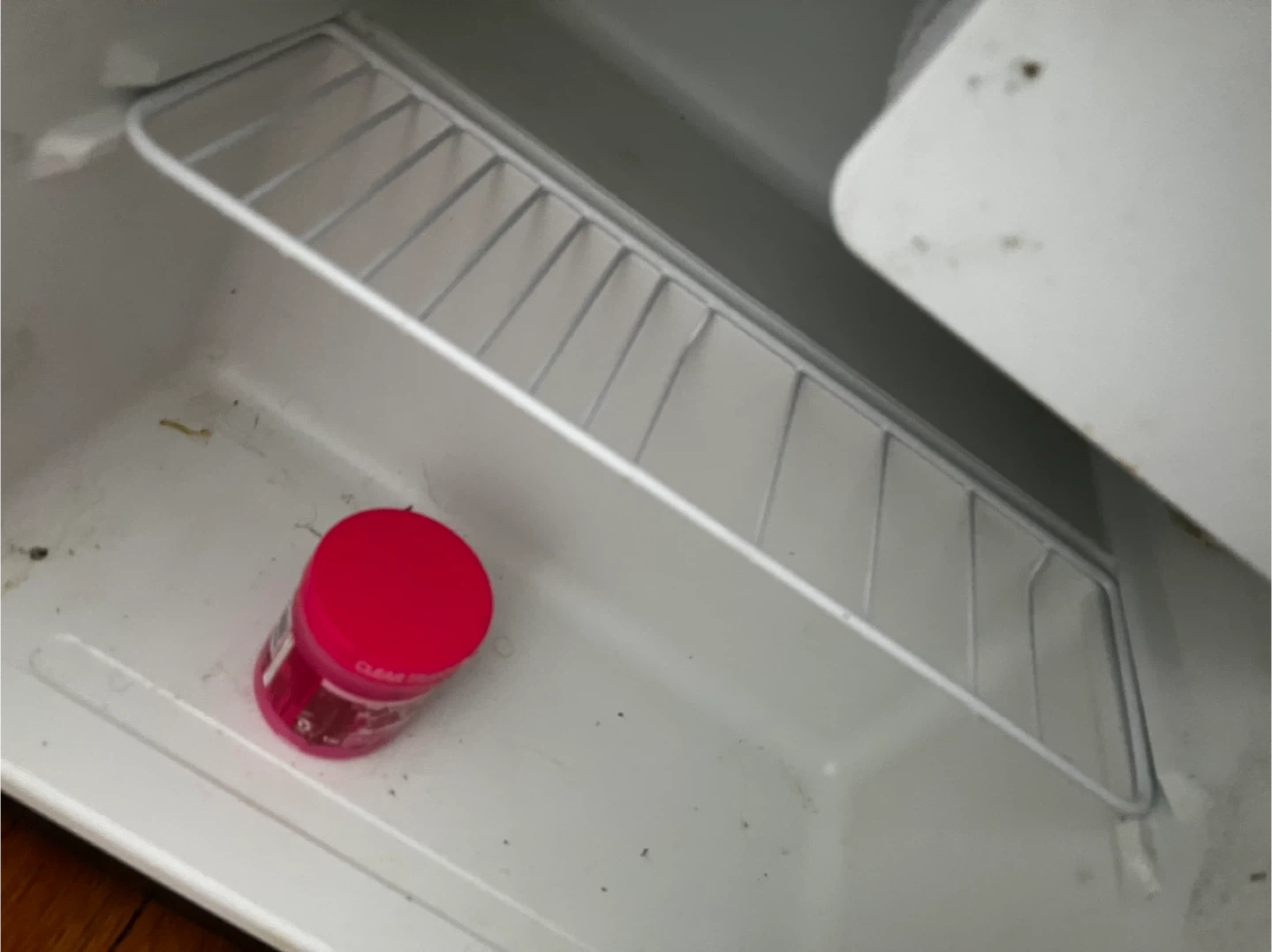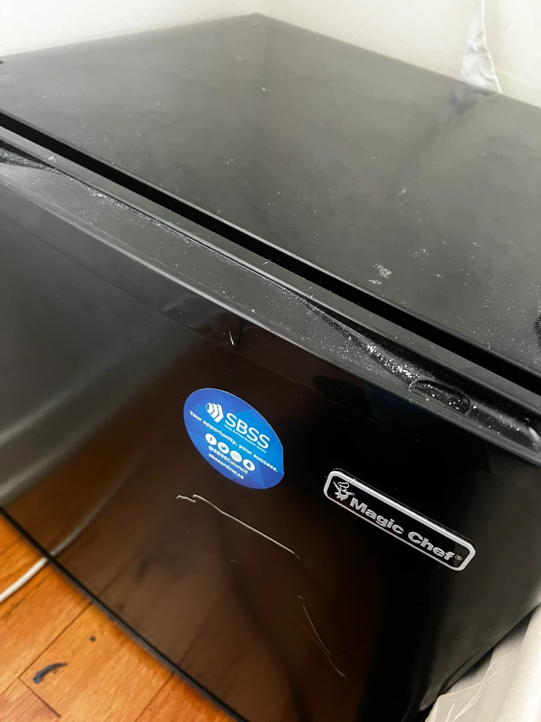 Black Magic Chef mini fridge. Comes with a wire rack inside. This compact fridge is perfect for small spaces like dorm rooms or offices.