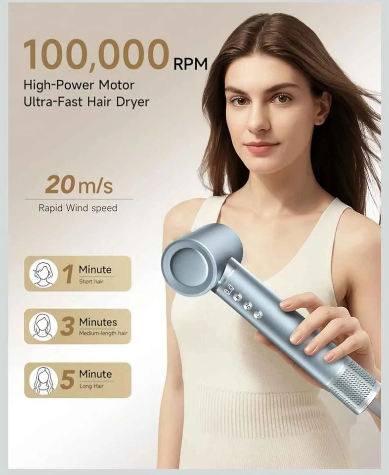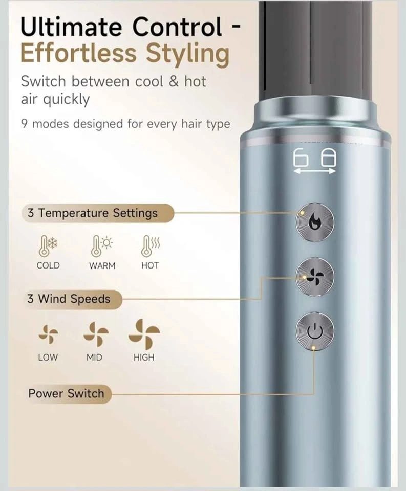 Brand new in box. All-in-1 hair styling tool with blow dry, curling, and brush attachments. Features 3 temperature settings and 3 speed settings. Includes left and right curling wands. An affordable Dyson dupe. 1100 watts. Great for a Christmas present.