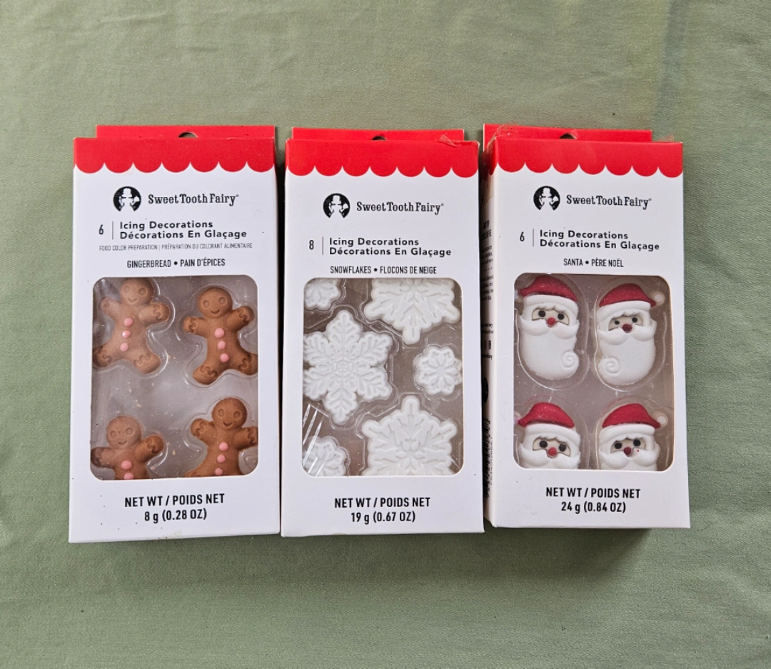Three packs of SweetToothFairy icing decorations. Gingerbread men, snowflakes, and Santa Claus designs. Perfect for holiday baking. Best by March (or May? I can never tell haha) 2025