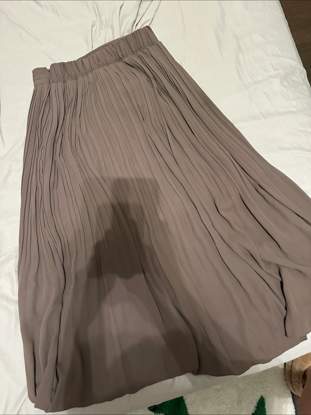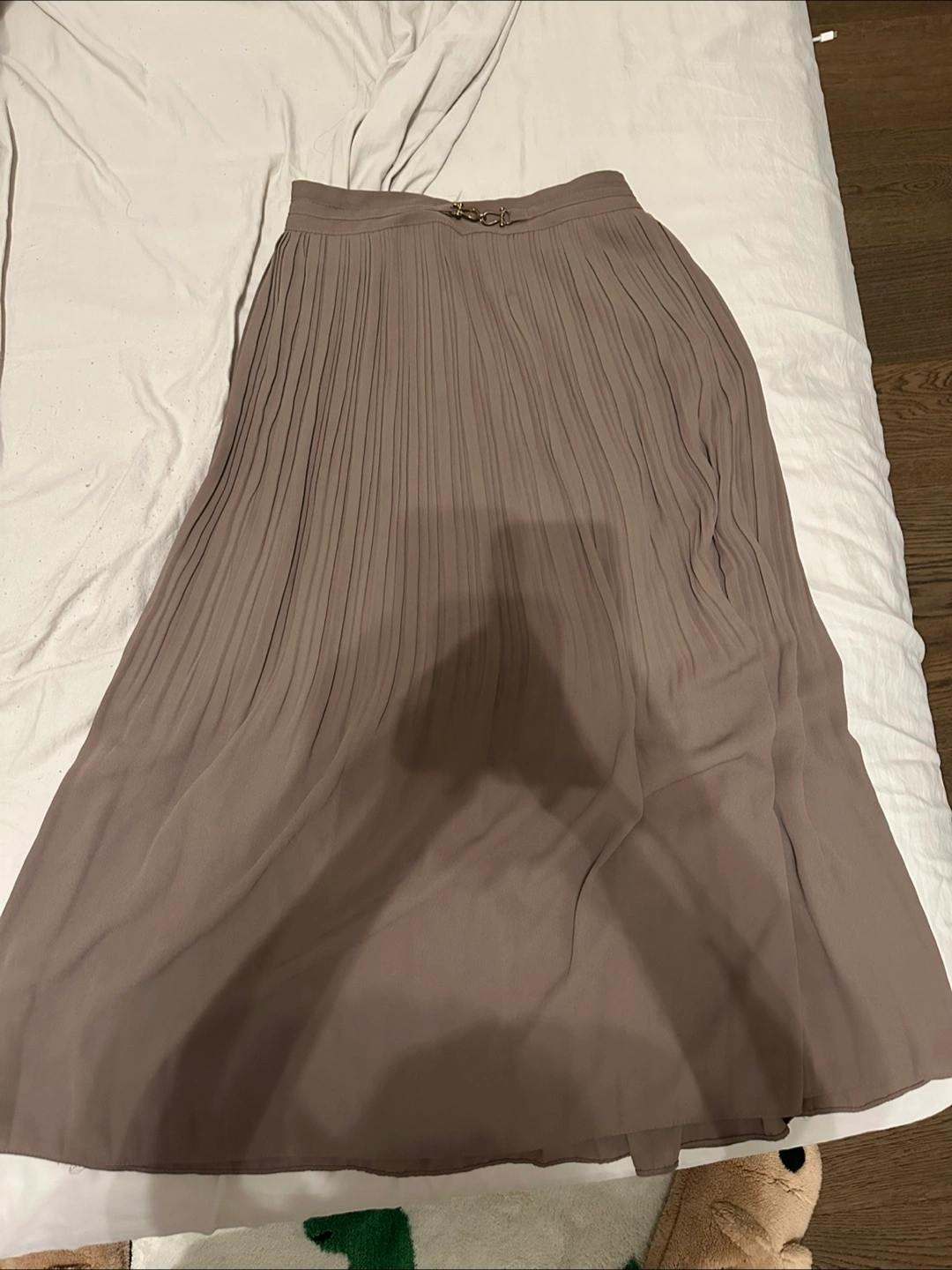 This taupe midi skirt features a pleated design with an elastic waistband and a decorative buckle at the front. It's made from a flowy, lightweight material. Perfect for dressing up or down!