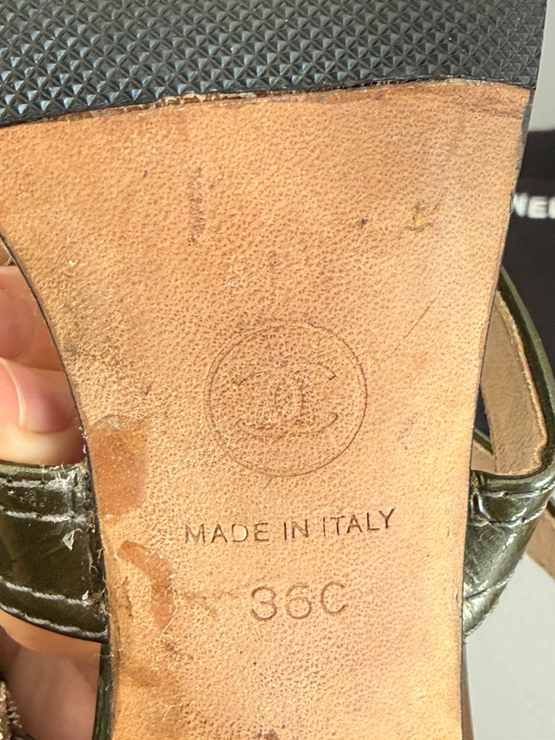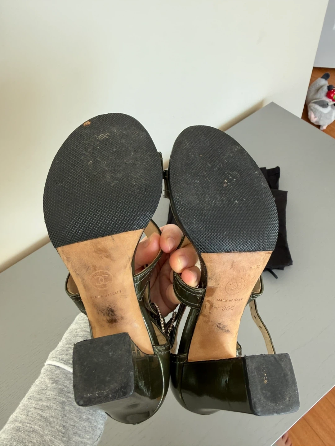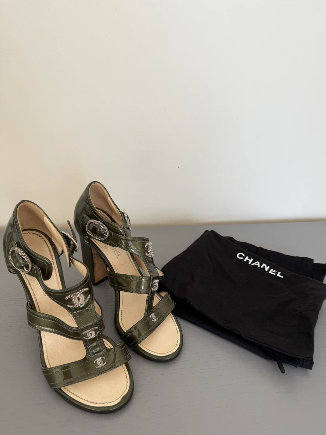 Authentic Chanel Green Patent Leather T-Strap Heels Size 36C