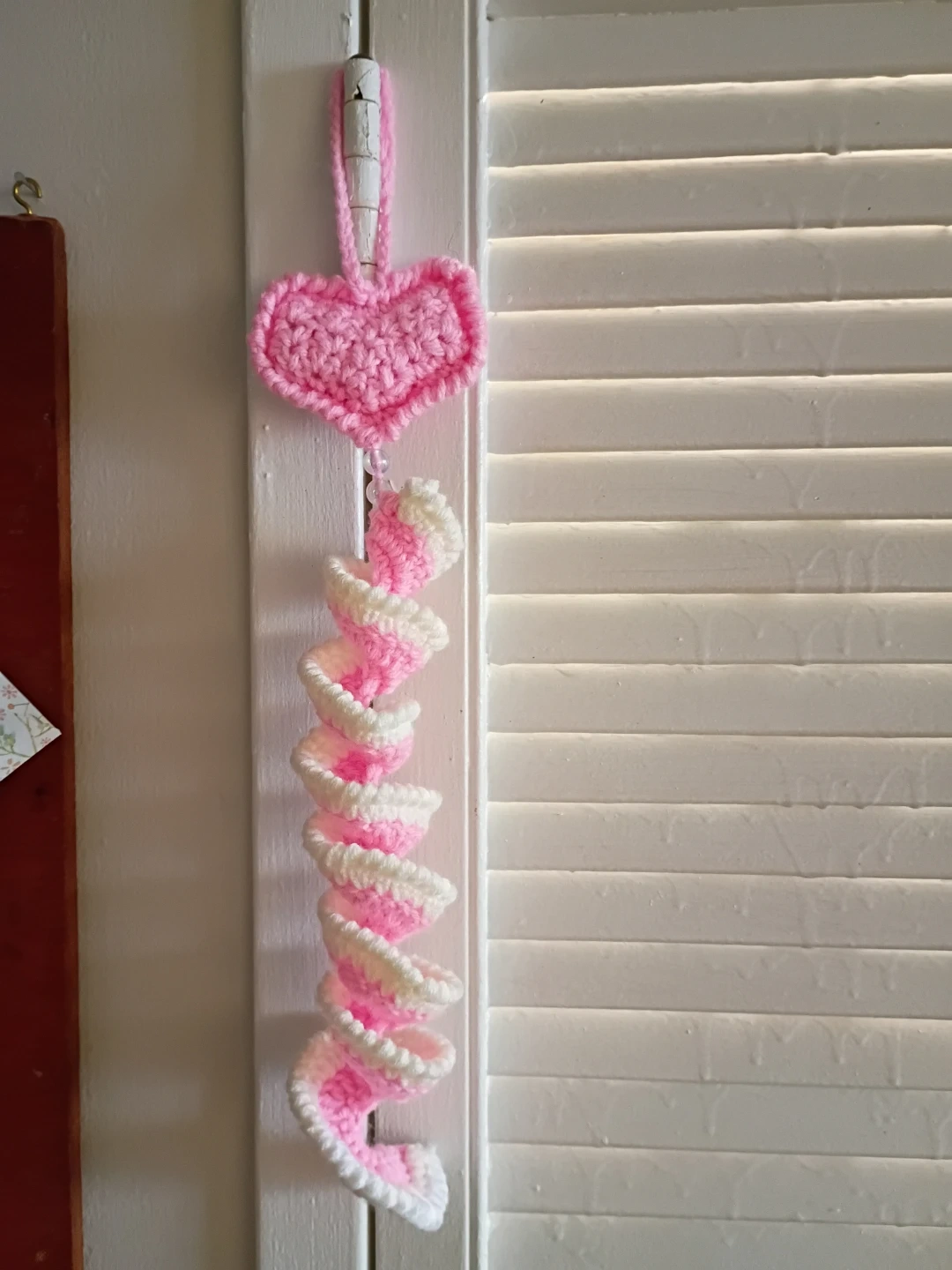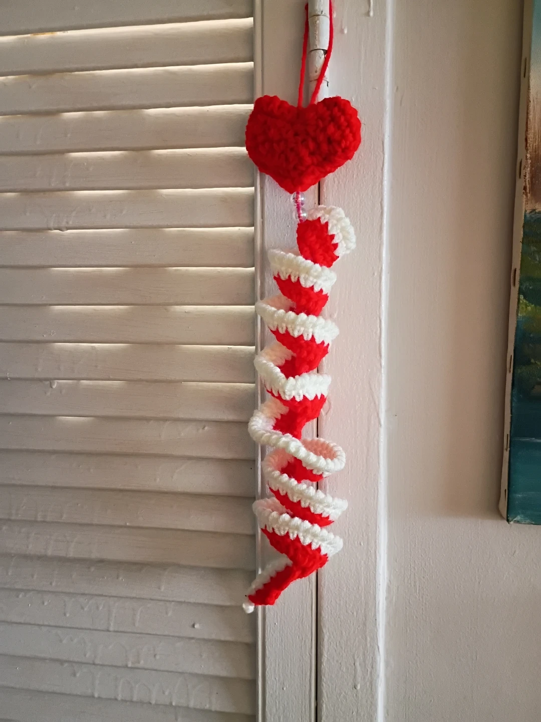Handmade crocheted wall hanging featuring a red heart at the top and a white and red spiral below. It's a unique decorative piece for any room. It's about 18 inches long. Handmade by me!