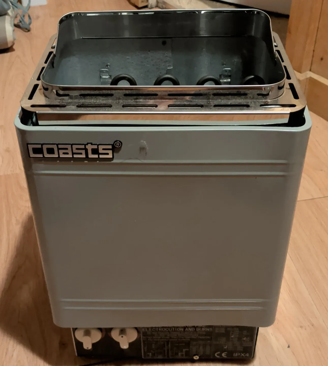 Coasts Sauna Heater unit. Absolutely new and unused. It's grey and has heating elements inside. Suitable for a home Wet-Sauna setup. CE IPX4 rated.
