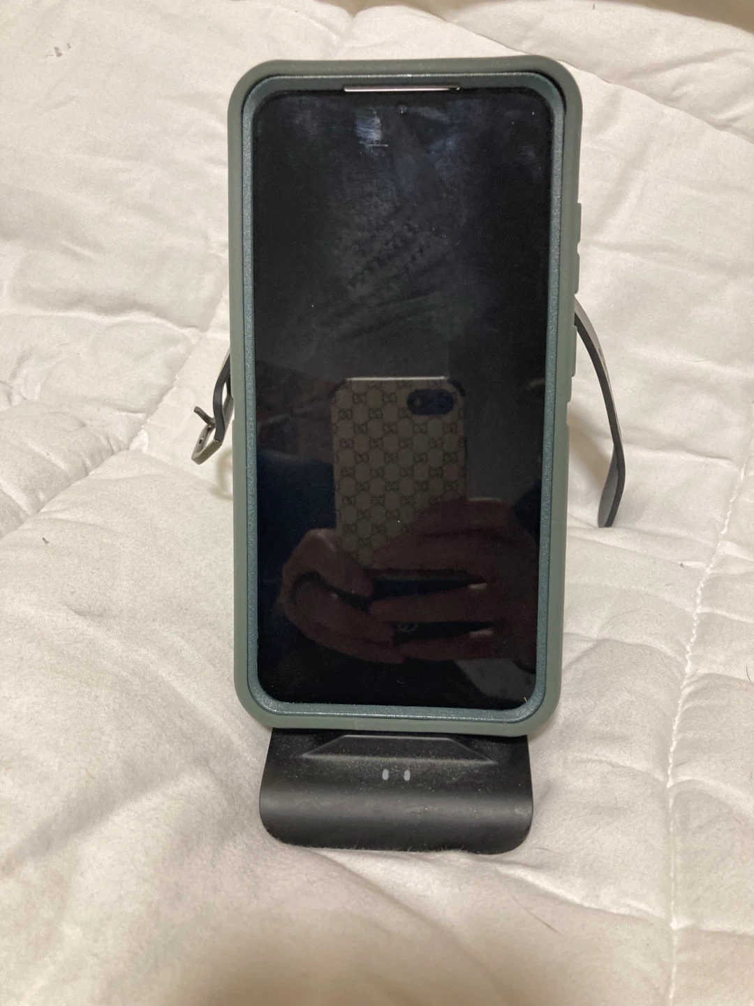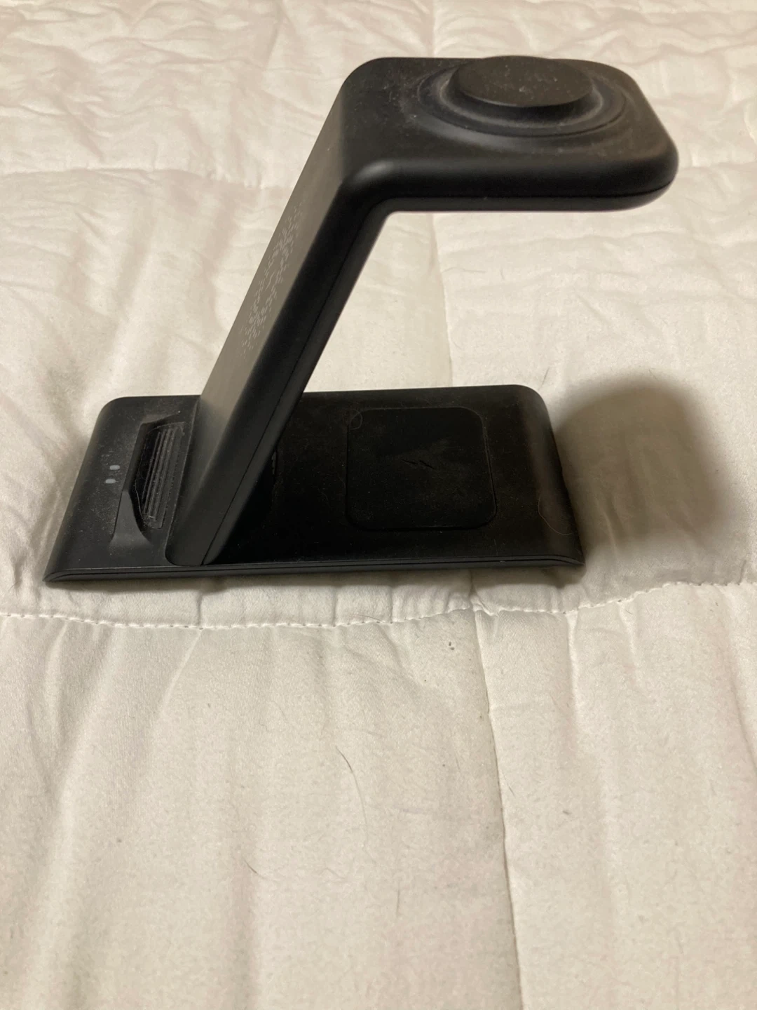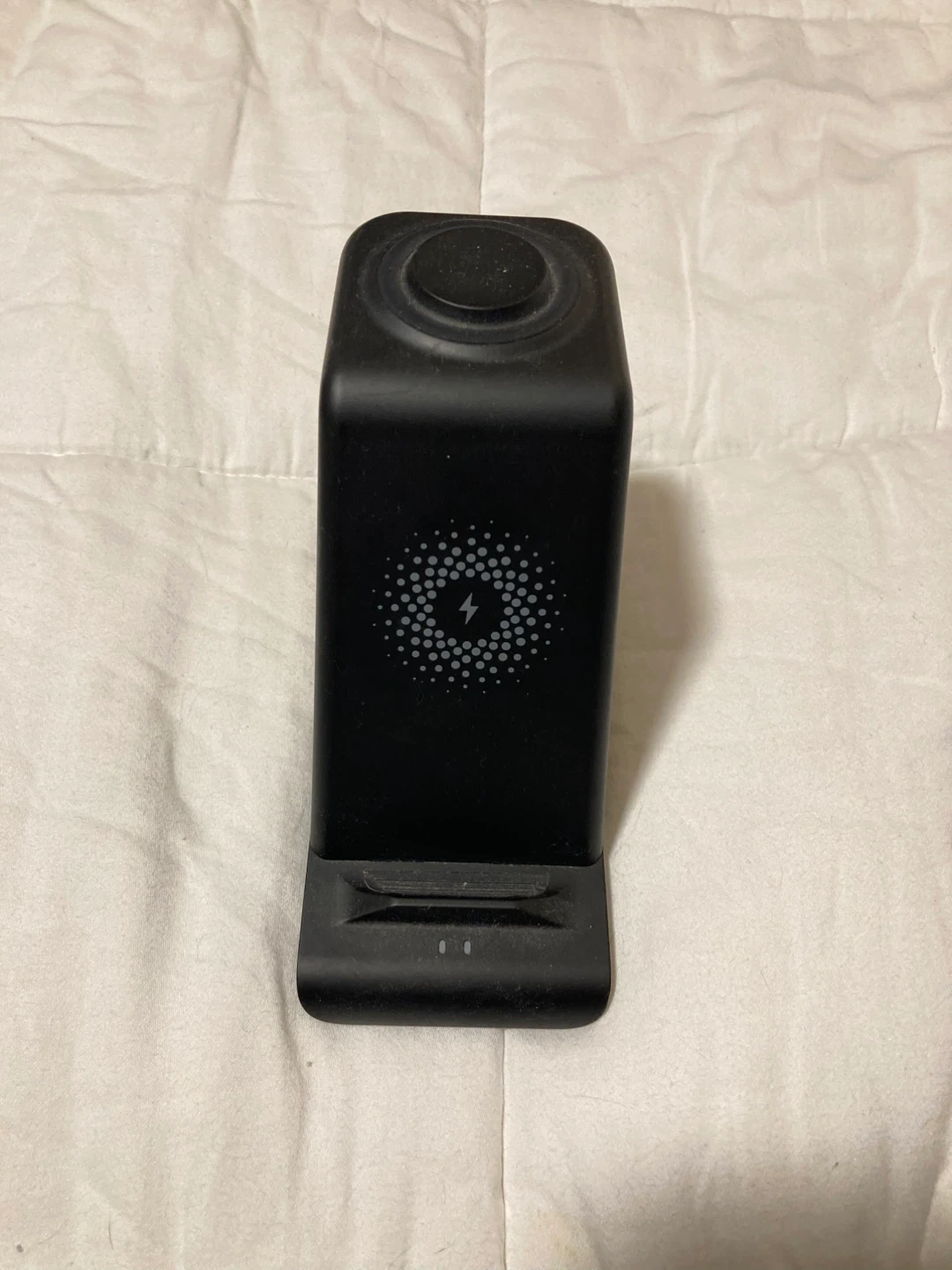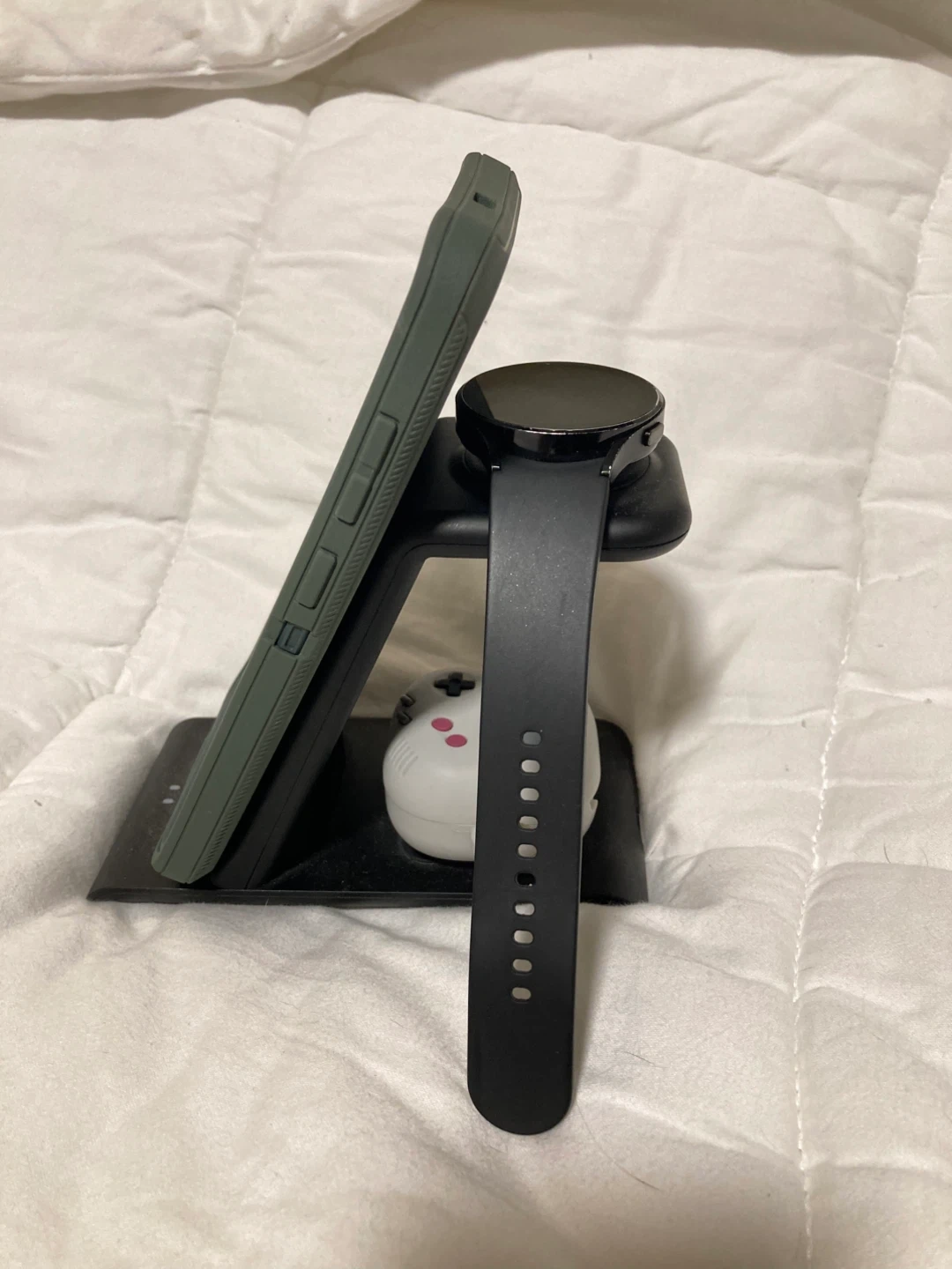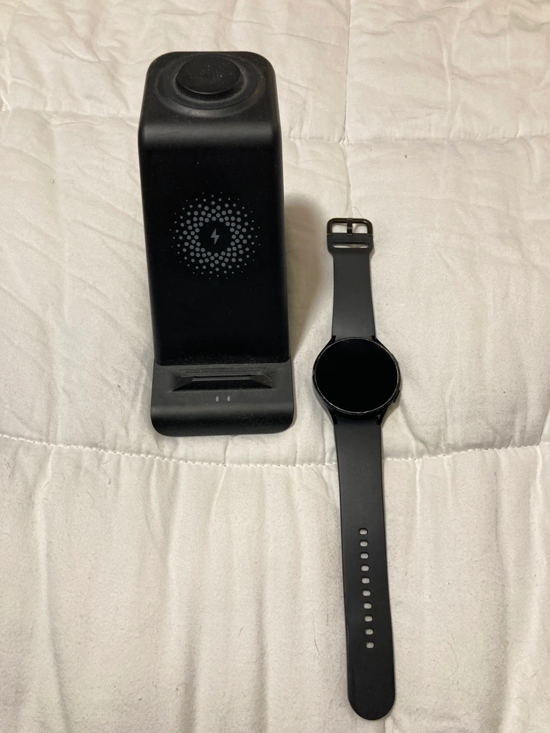 Selling a Samsung Galaxy Watch 4 in black, 44mm size. It comes with a charger stand that works for watch, phone and earbuds.
